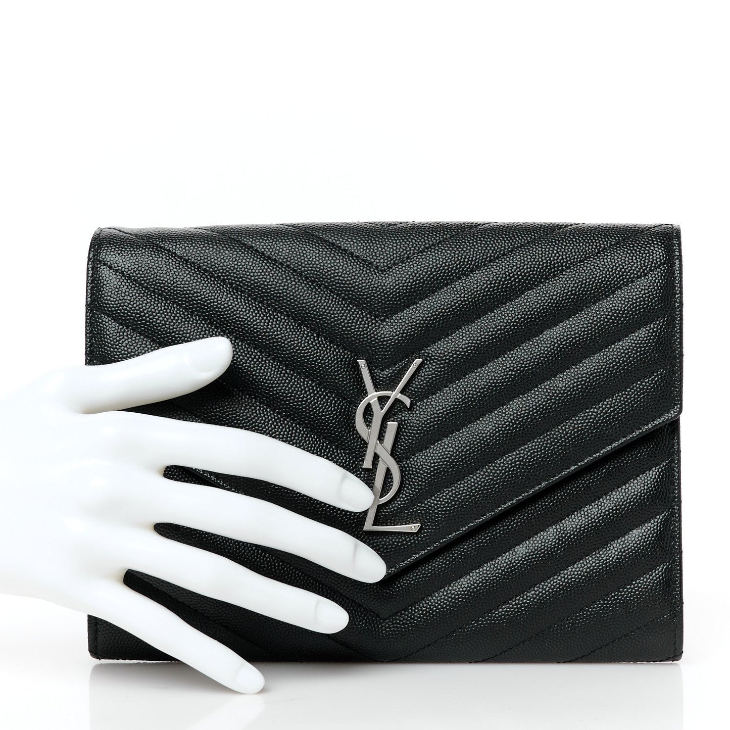 This is an authentic SAINT LAURENT Grain De Poudre Matelasse Chevron Monogram Envelope Clutch in Black. This elegant clutch is crafted of finely pebbled chevron quilted leather in black. The bag features a gold classic YSL emblem on the flap and opens to a black fabric interior with a patch pocket.Follow this item for alerts. Saint Laurent is a registered trademark of Saint Laurent. FASHIONPHILE is not affiliated with Saint Laurent.