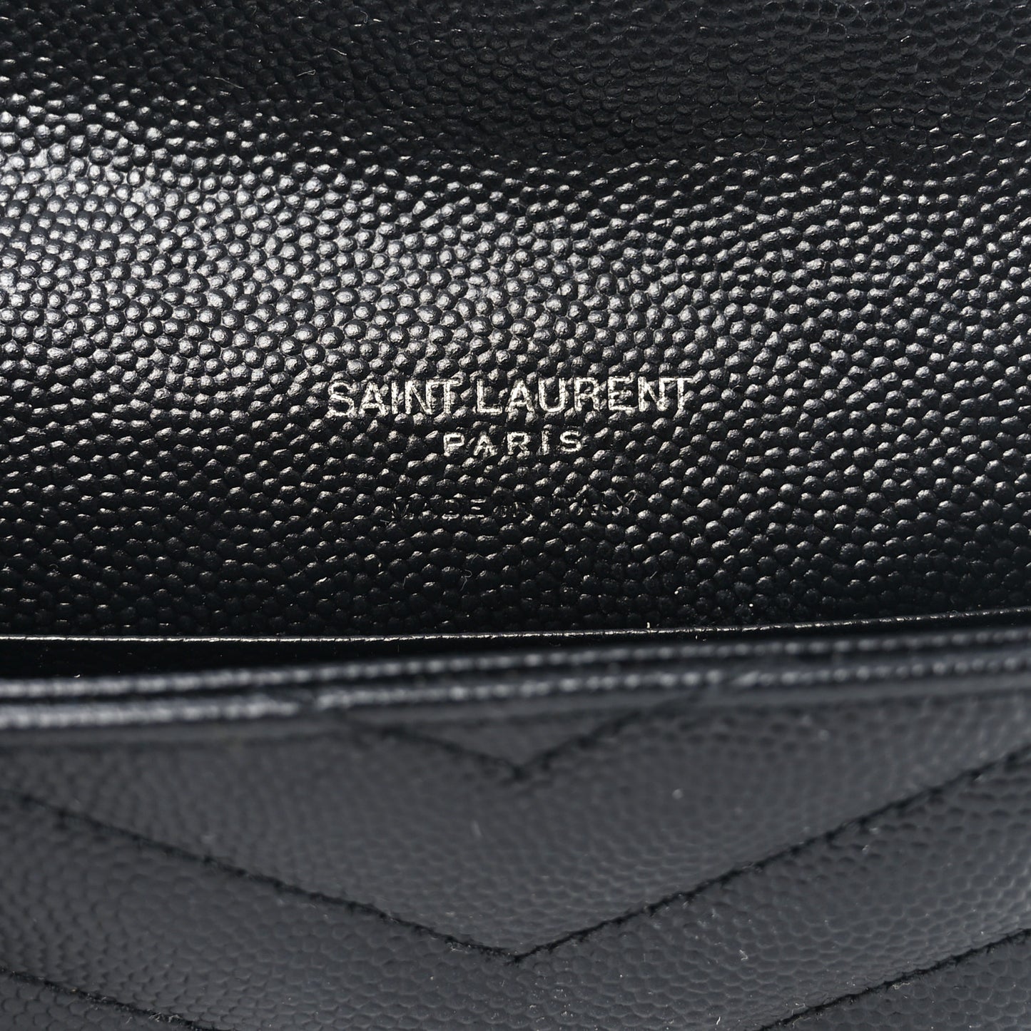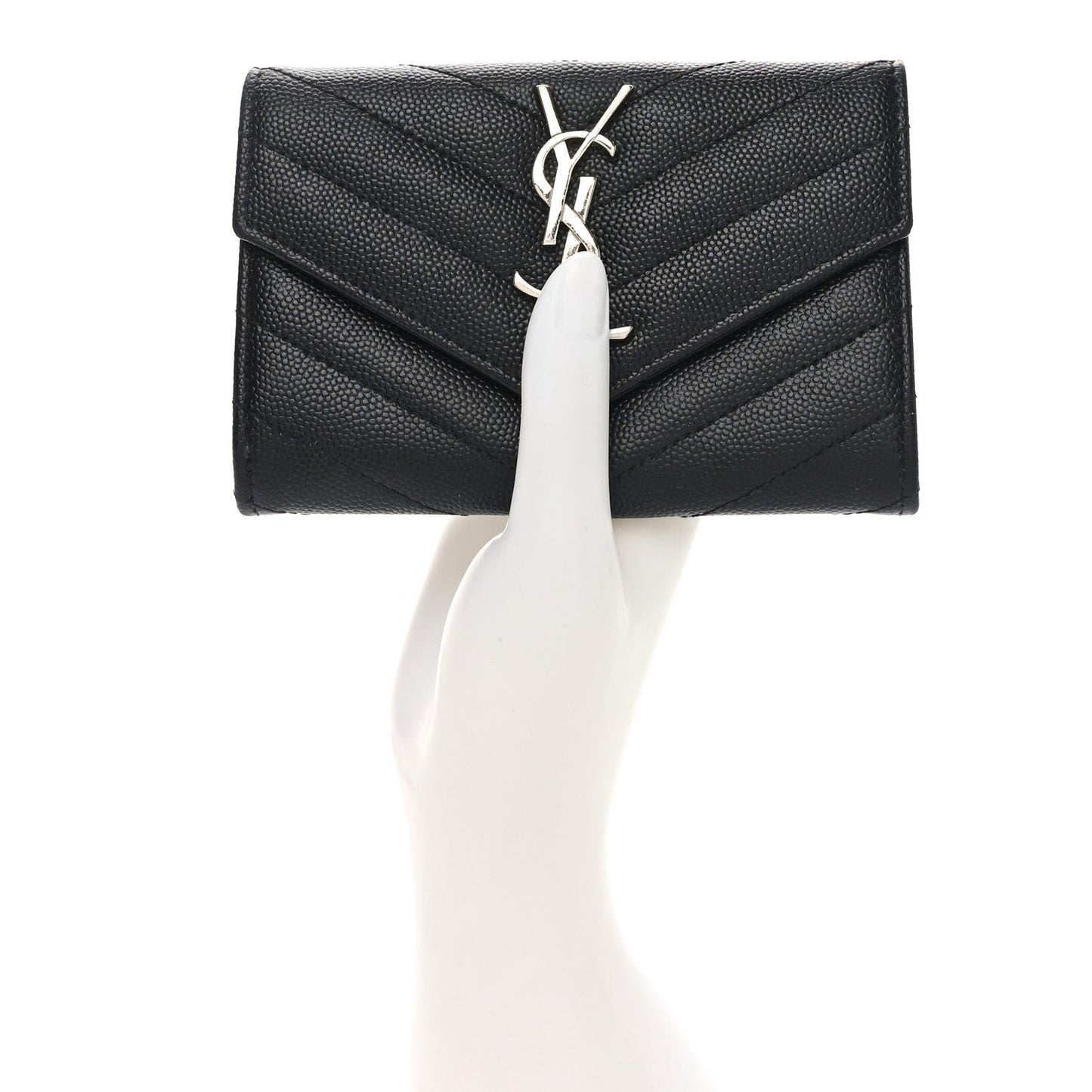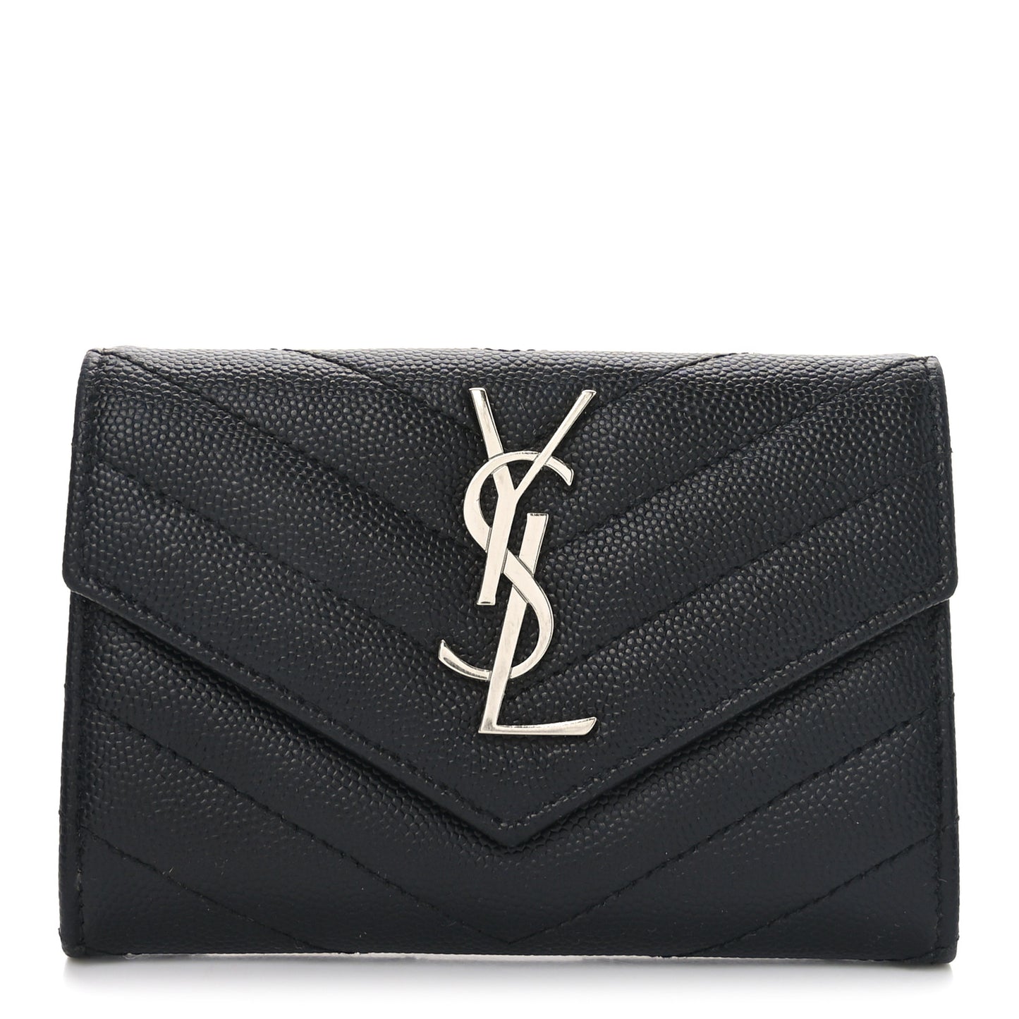This is an authentic SAINT LAURENT Grain De Poudre Matelasse Chevron Small Monogram Envelope Wallet in Black. This wallet is crafted of chevron quilted leather in black. The wallet features a facing flap with a prominent polished silver tone YSL logo and an exterior rear patch pocket. The flap opens to a black leather interior with card slots.Follow this item for alerts. Saint Laurent is a registered trademark of Saint Laurent. FASHIONPHILE is not affiliated with Saint Laurent.
