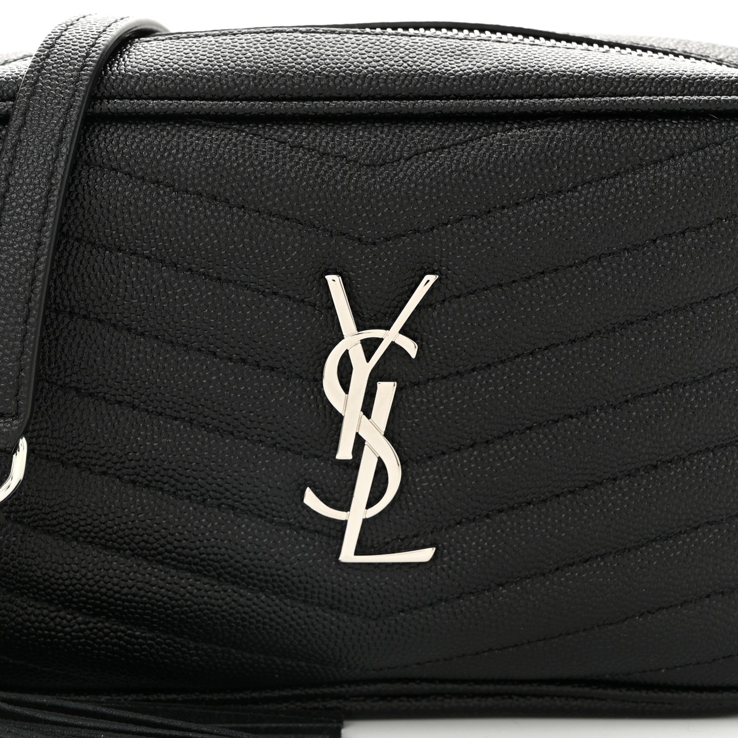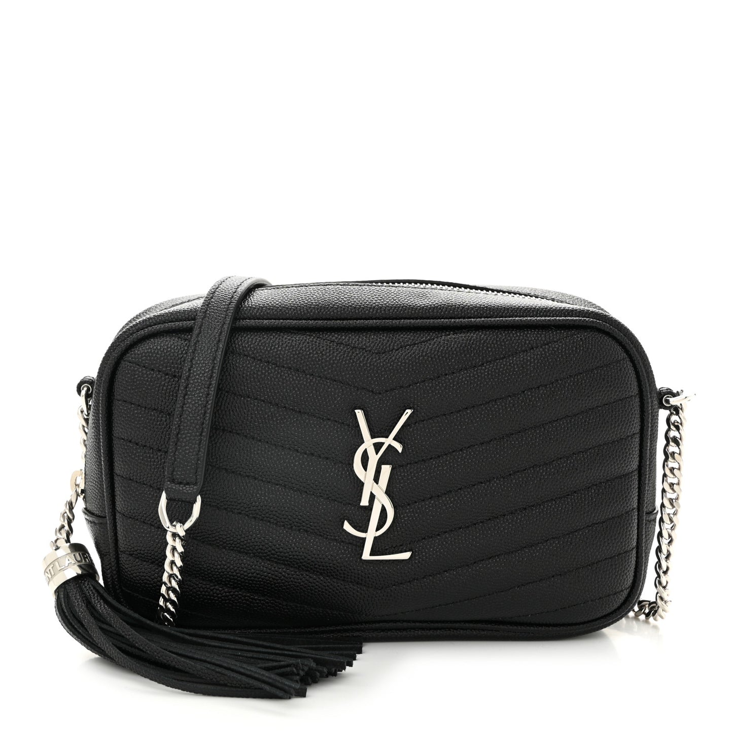 This is an authentic SAINT LAURENT Grain De Poudre Matelasse Monogram Mini Lou Camera Bag in Black. This chic shoulder bag is crafted of beautiful textured calfskin leather in black. The bag features a silver chain strap with a leather shoulder pad, silver hardware, and a decorative tassel zipper pull. The top zipper opens to a compact black leather interior with card slots.Follow this item for alerts. Saint Laurent is a registered trademark of Saint Laurent. FASHIONPHILE is not affiliated with Saint Laurent.