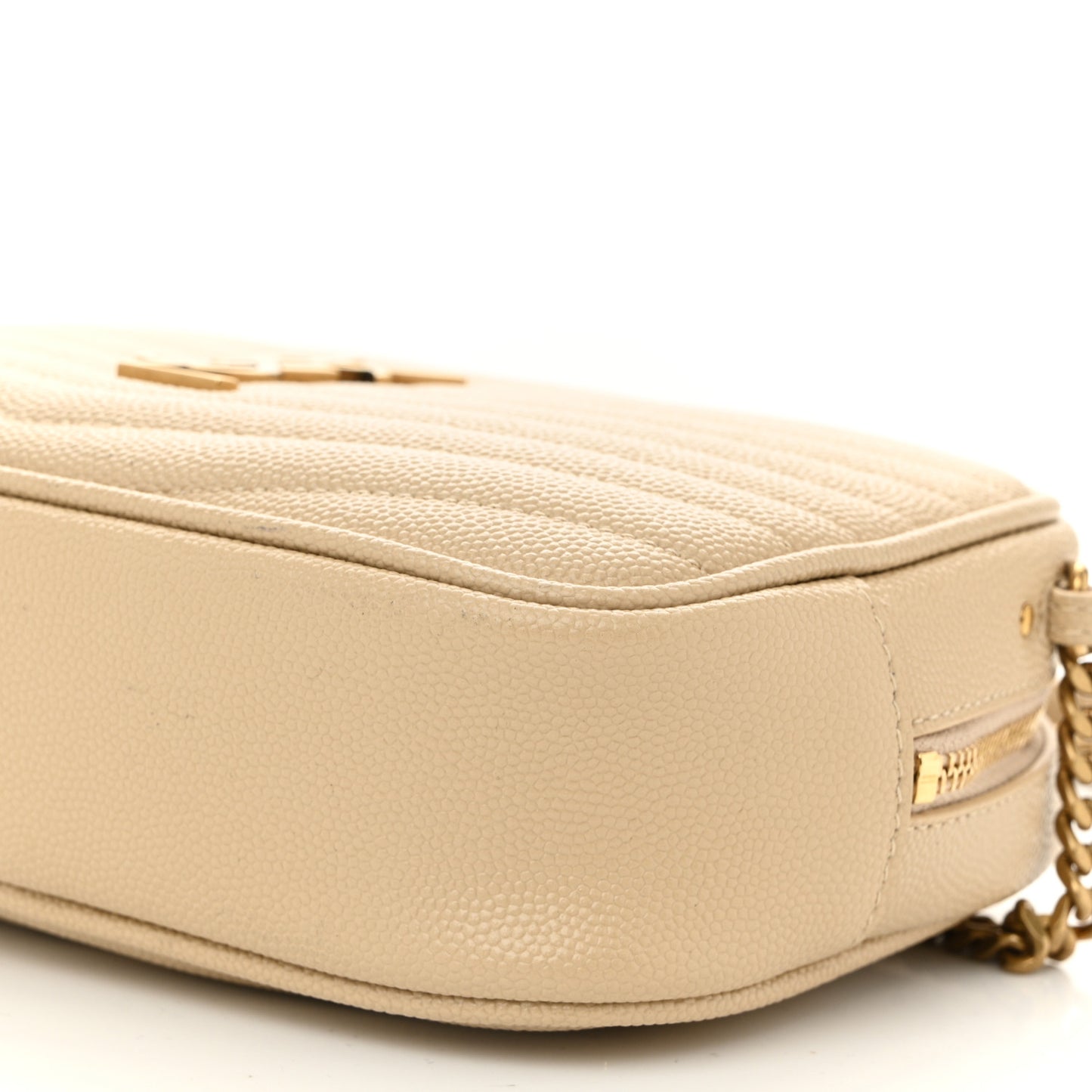 This is an authentic SAINT LAURENT Grain De Poudre Matelasse Monogram Mini Lou Camera Bag in Dark Beige. This chic shoulder bag is crafted of pebbled calfskin leather in beige. The bag features a gold chain shoulder strap with matching leather shoulder pad, a leather tassel zipper pull, and a gold YSL logo on the front. The top zipper opens to a black leather interior with card slots.Follow this item for alerts. Saint Laurent is a registered trademark of Saint Laurent. FASHIONPHILE is not affiliated with Saint Laurent.