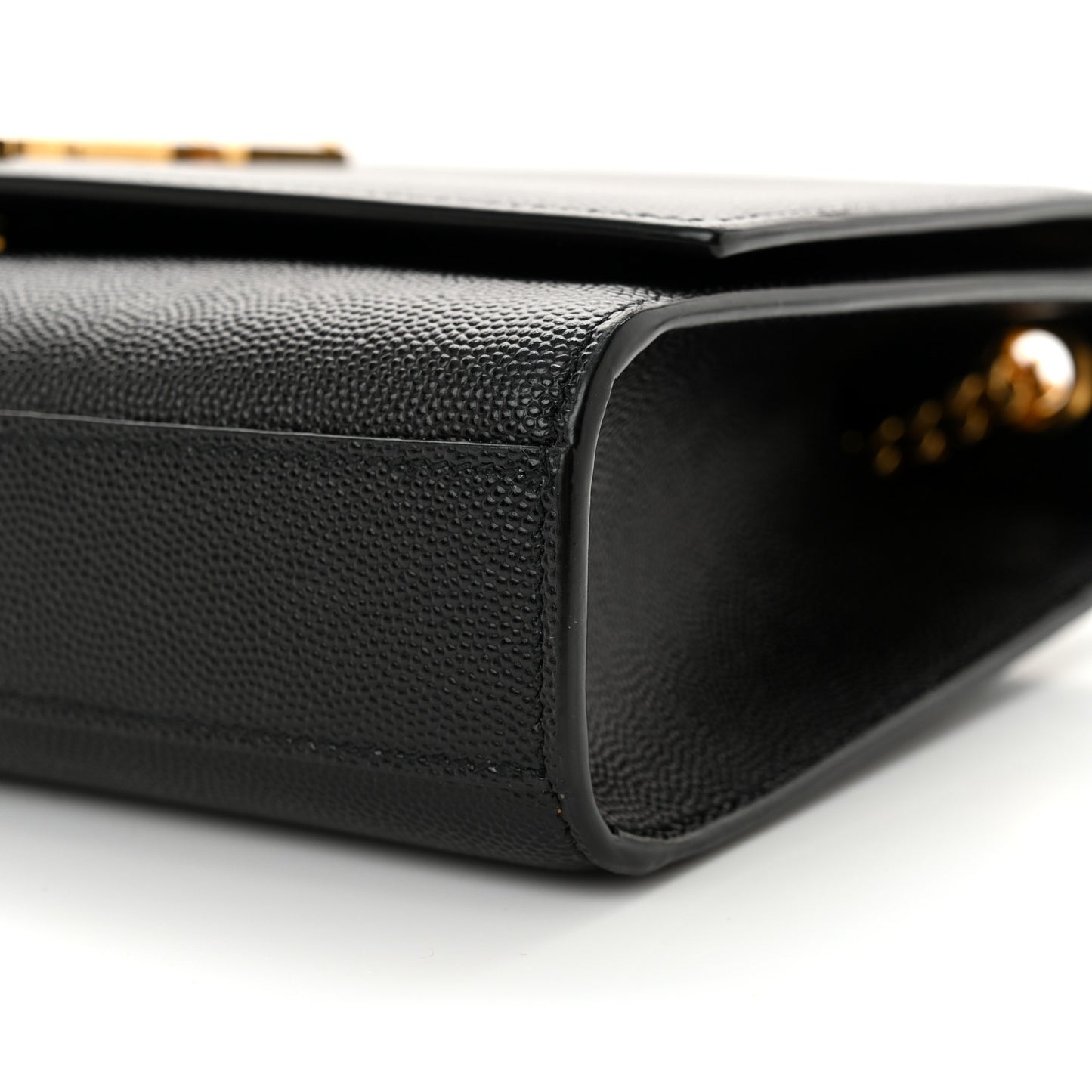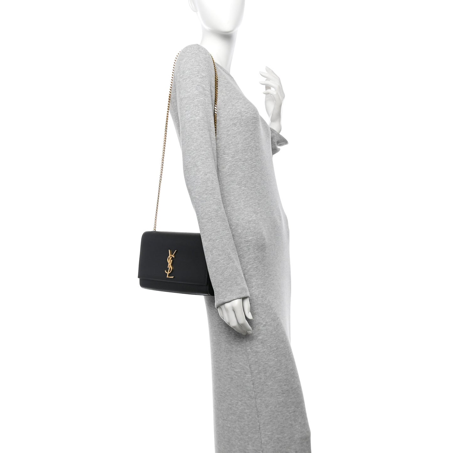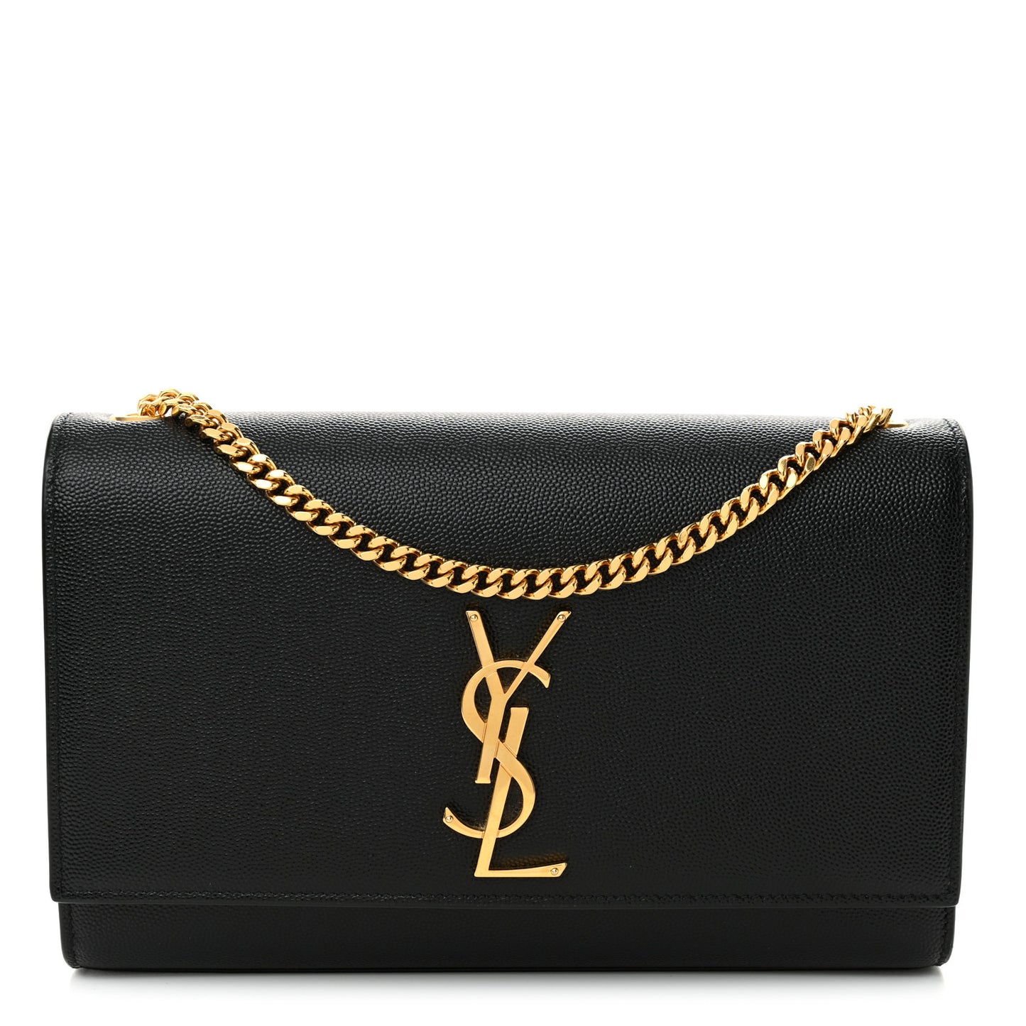 This is an authentic SAINT LAURENT Grain De Poudre Medium Classic Monogram Kate Satchel in Black. This stylish shoulder bag is crafted of finely textured calfskin leather in black. The bag features a gold chain-link shoulder strap and a matching YSL logo on the front. The crossover flap opens to a black fabric interior with a patch pocket.Follow this item for alerts. Saint Laurent is a registered trademark of Saint Laurent. FASHIONPHILE is not affiliated with Saint Laurent.