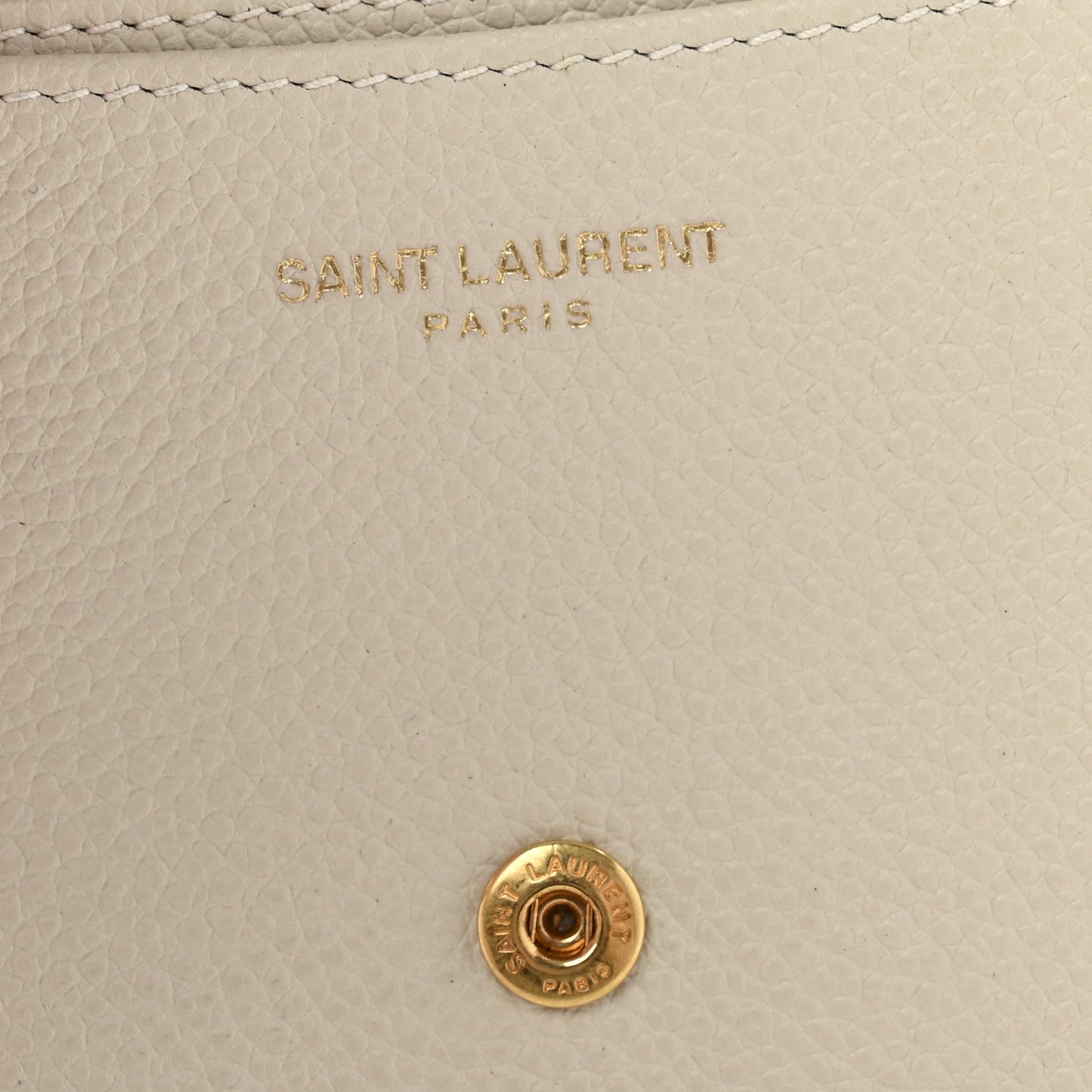 This is an authentic SAINT LAURENT Grain De Poudre Mixed Matelasse Compact Fold Wallet in White. This elegant compact wallet features fine pebbled leather in white. The wallet features a facing flap with a prominent gold YSL logo. The flap opens to a matching leather interior with card slots and patch pockets.Follow this item for alerts. Saint Laurent is a registered trademark of Saint Laurent. FASHIONPHILE is not affiliated with Saint Laurent.