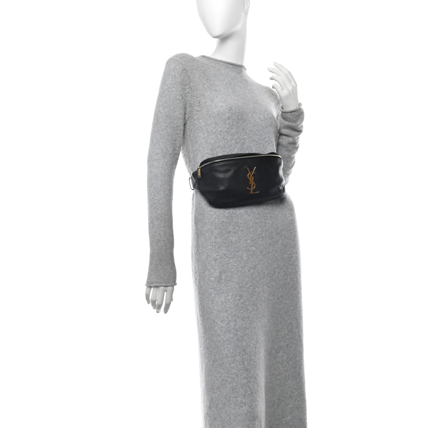 This is an authentic SAINT LAURENT Grain De Poudre Monogram Belt Bag in Black. This chic belt bag is crafted of textured calfskin leather in black. It features an adjustable belt strap and aged gold YSL logo. The top zipper opens to a compact black fabric interior with a patch pocket.Follow this item for alerts. Saint Laurent is a registered trademark of Saint Laurent. FASHIONPHILE is not affiliated with Saint Laurent.