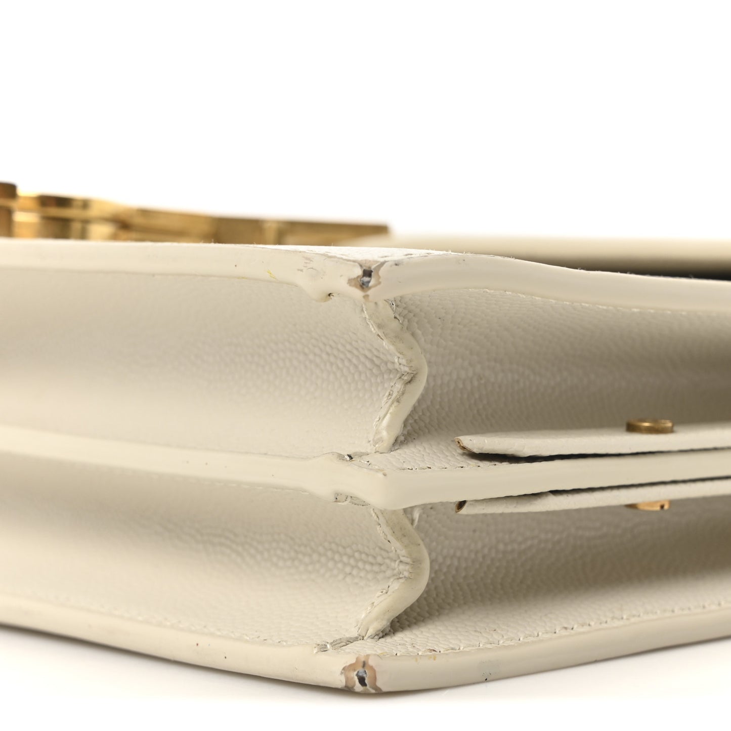 This is an authentic SAINT LAURENT Grain De Poudre Monogram Cassandra Clasp Bag in Crema Soft. This elegant shoulder bag is crafted of grained calfskin leather in off-white. The bag features an aged gold chainlink strap and a crossover flap with a gold YSL monogram twist lock. This opens to a black leather interior with a zipper and patch pockets.Follow this item for alerts. Saint Laurent is a registered trademark of Saint Laurent. FASHIONPHILE is not affiliated with Saint Laurent.