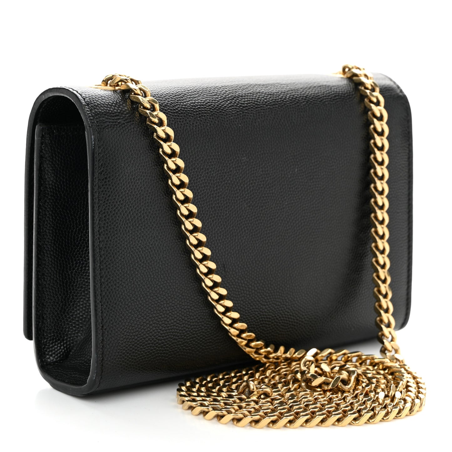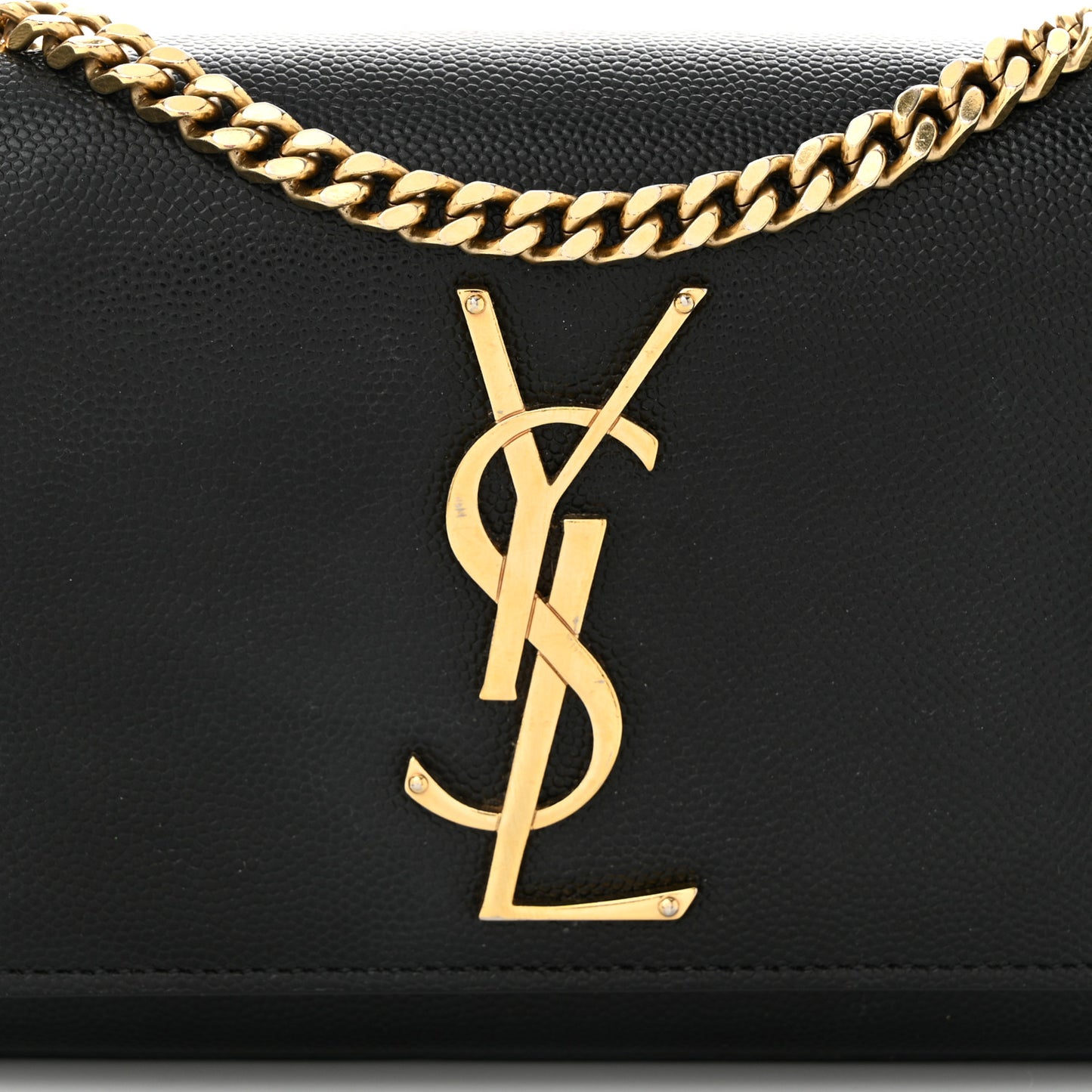 This is an authentic SAINT LAURENT Grain De Poudre Small Monogram Kate Satchel in Black. This ultra-stylish shoulder bag is finely crafted of grained calfskin leather in black. The bag features a gold bijoux shoulder strap and a crossover flap with a matching gold YSL logo. The flap opens to a black fabric interior with a patch pocket.Follow this item for alerts. Saint Laurent is a registered trademark of Saint Laurent. FASHIONPHILE is not affiliated with Saint Laurent.