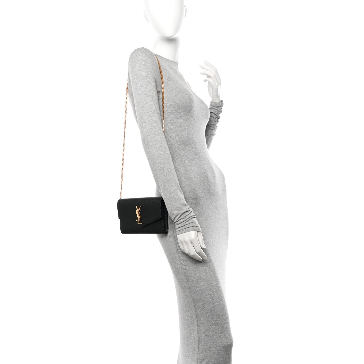 This is an authentic SAINT LAURENT Grain De Poudre Uptown Chain Wallet in Black. This tote is crafted of pebbled calfskin leather in black. The bag features an optional polished black chain strap and a matching black YSL monogram detail on the crossover flap. The bag opens to a partitioned black leather interior with patch pockets.Follow this item for alerts. Saint Laurent is a registered trademark of Saint Laurent. FASHIONPHILE is not affiliated with Saint Laurent.