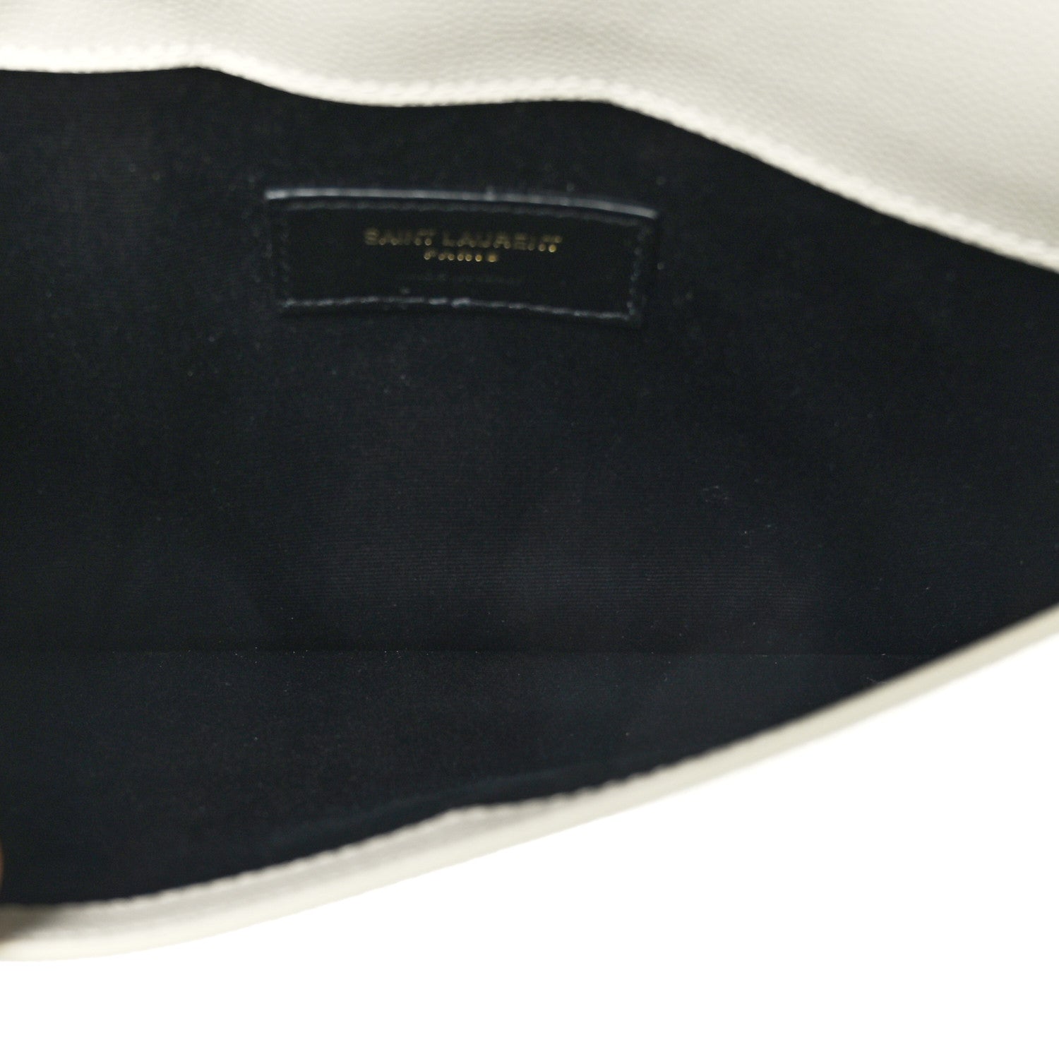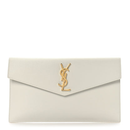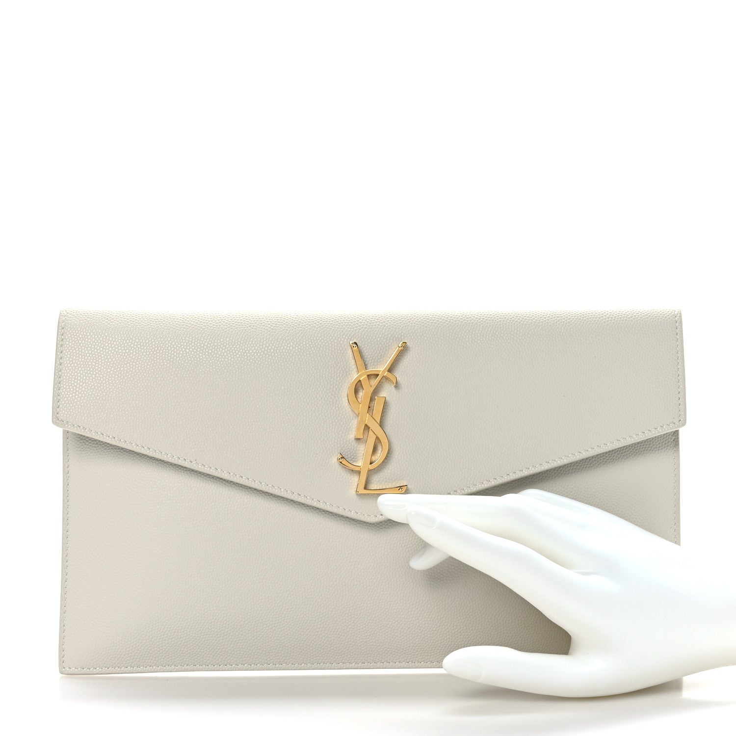 This is an authentic SAINT LAURENT Grain De Poudre Calfskin Uptown Pouch in Crema Soft. This clutch is crafted of calfskin leather in ivory, and features a facing V-shaped flap with a prominent gold YSL logo. The flap opens to a black fabric interior.Follow this item for alerts. Saint Laurent is a registered trademark of Saint Laurent. FASHIONPHILE is not affiliated with Saint Laurent.