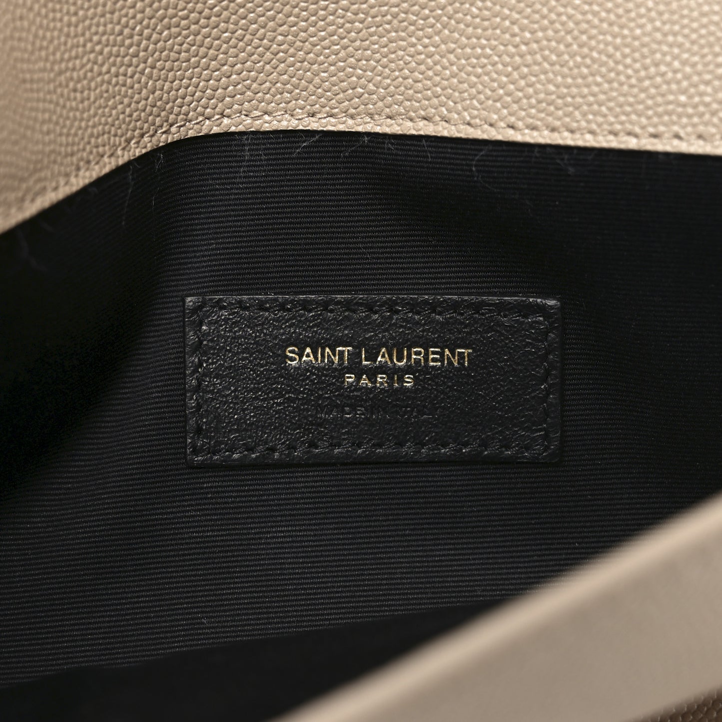 This is an authentic SAINT LAURENT Grain De Poudre Uptown Pouch in Dark Beige/ This clutch is crafted of grained calfskin leather in beige and features a facing V-shaped flap with a prominent polished gold YSL logo. The flap opens to a black fabric interior.Follow this item for alerts. Saint Laurent is a registered trademark of Saint Laurent. FASHIONPHILE is not affiliated with Saint Laurent.