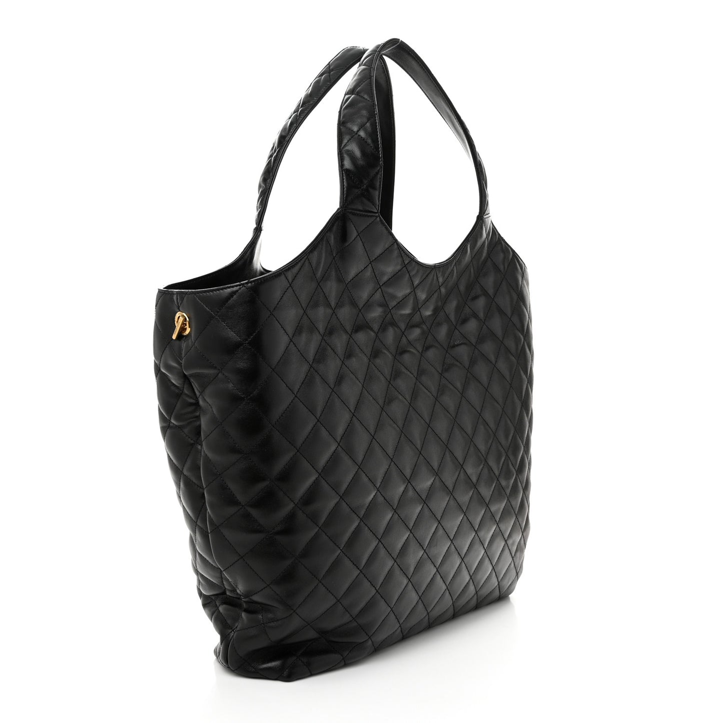 This is an authentic SAINT LAURENT Lambskin Quilted Maxi Icare Shopping Tote in Black. This chic tote is crafted of supple diamond-stitched calfskin leather in black. The bag features leather handles, and a large aged gold YSL emblem on the front. The top opens to a black fabric interior with an aged gold chain link strap to cinch the sides and a matching removable pouch.Follow this item for alerts. Saint Laurent is a registered trademark of Saint Laurent. FASHIONPHILE is not affiliated with Saint Laurent.