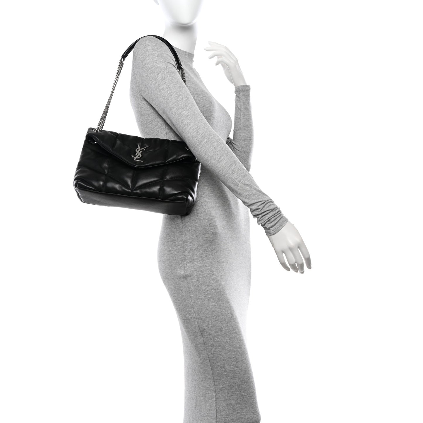 This is an authentic SAINT LAURENT Lambskin Quilted Small Loulou Puffer Monogram Chain Satchel in Black. This bag features chic quilted lambskin leather in black. The bag features silver chain-link shoulder straps with black leather shoulder pads. The front flap features a prominent silver YSL monogram detail and opens to a black fabric interior with a zipper pocket.Follow this item for alerts. Saint Laurent is a registered trademark of Saint Laurent. FASHIONPHILE is not affiliated with Saint Laurent.