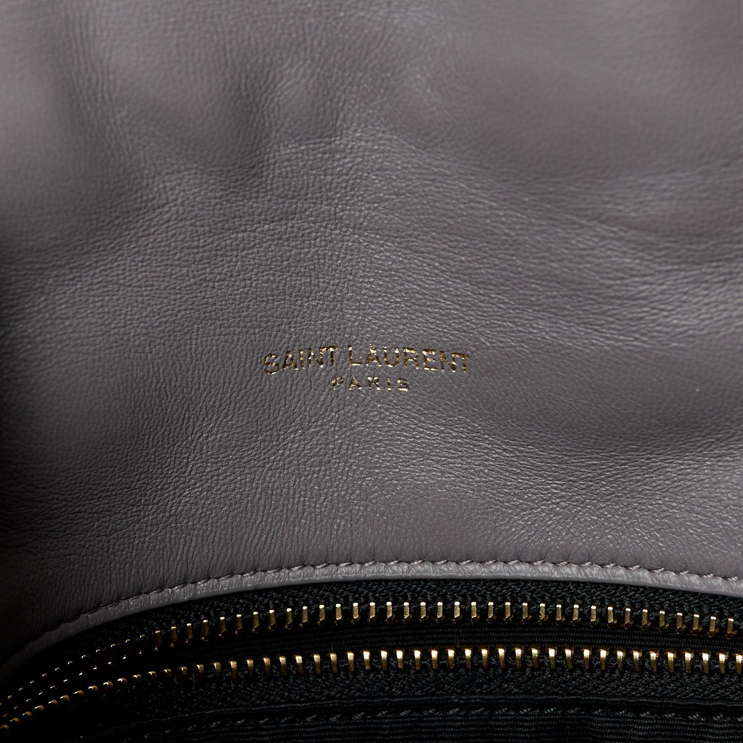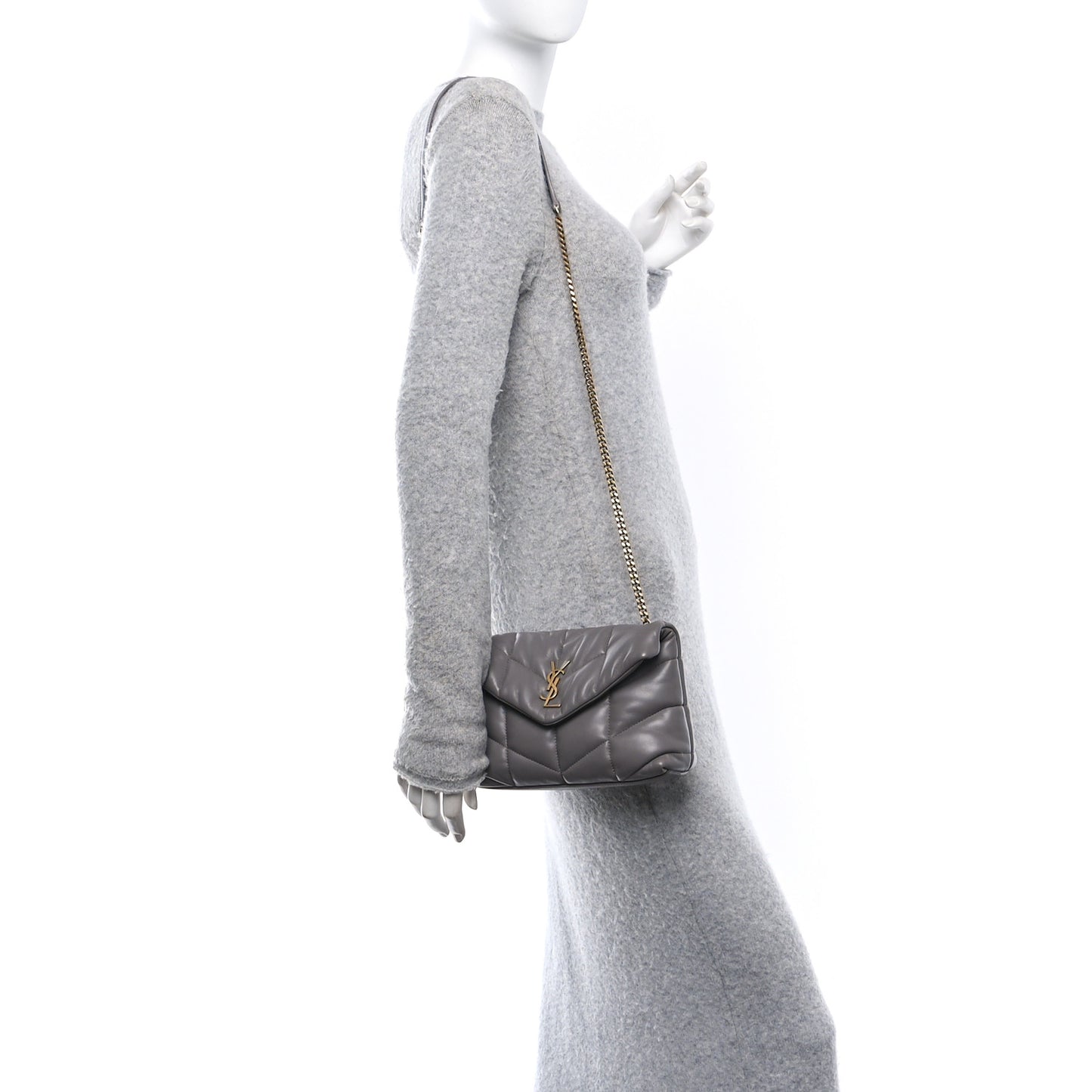 This is an authentic SAINT LAURENT Lambskin Quilted Toy Loulou Puffer Monogram Chain Satchel in Fog. This mini handbag is crafted of chevron quilted lambskin leather in grey. It features an aged gold chain strap with leather shoulder pad and crossover flap with YSL emblem. This opens with a magnetic snap to a black fabric interior with a zippered pocket and leather card slots.Follow this item for alerts. Saint Laurent is a registered trademark of Saint Laurent. FASHIONPHILE is not affiliated with Saint Laurent.