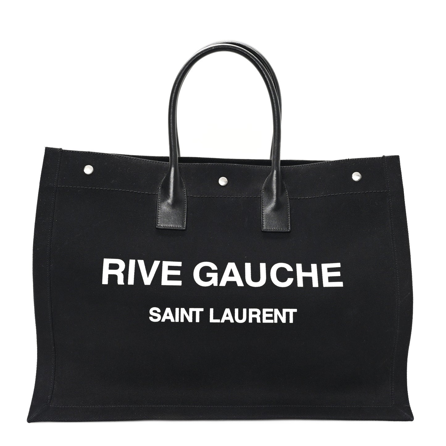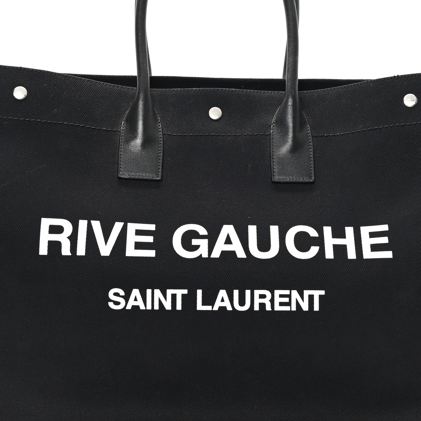 This is an authentic SAINT LAURENT Linen Calfskin Rive Gauche Tote in Black. This stylish tote is crafted of black linen with "Rive Gauche, Saint Laurent" printed in white across the front. The tote features black rolled leather handles and is open to a spacious interior with a hanging zipper pocket.Follow this item for alerts. Saint Laurent is a registered trademark of Saint Laurent. FASHIONPHILE is not affiliated with Saint Laurent.