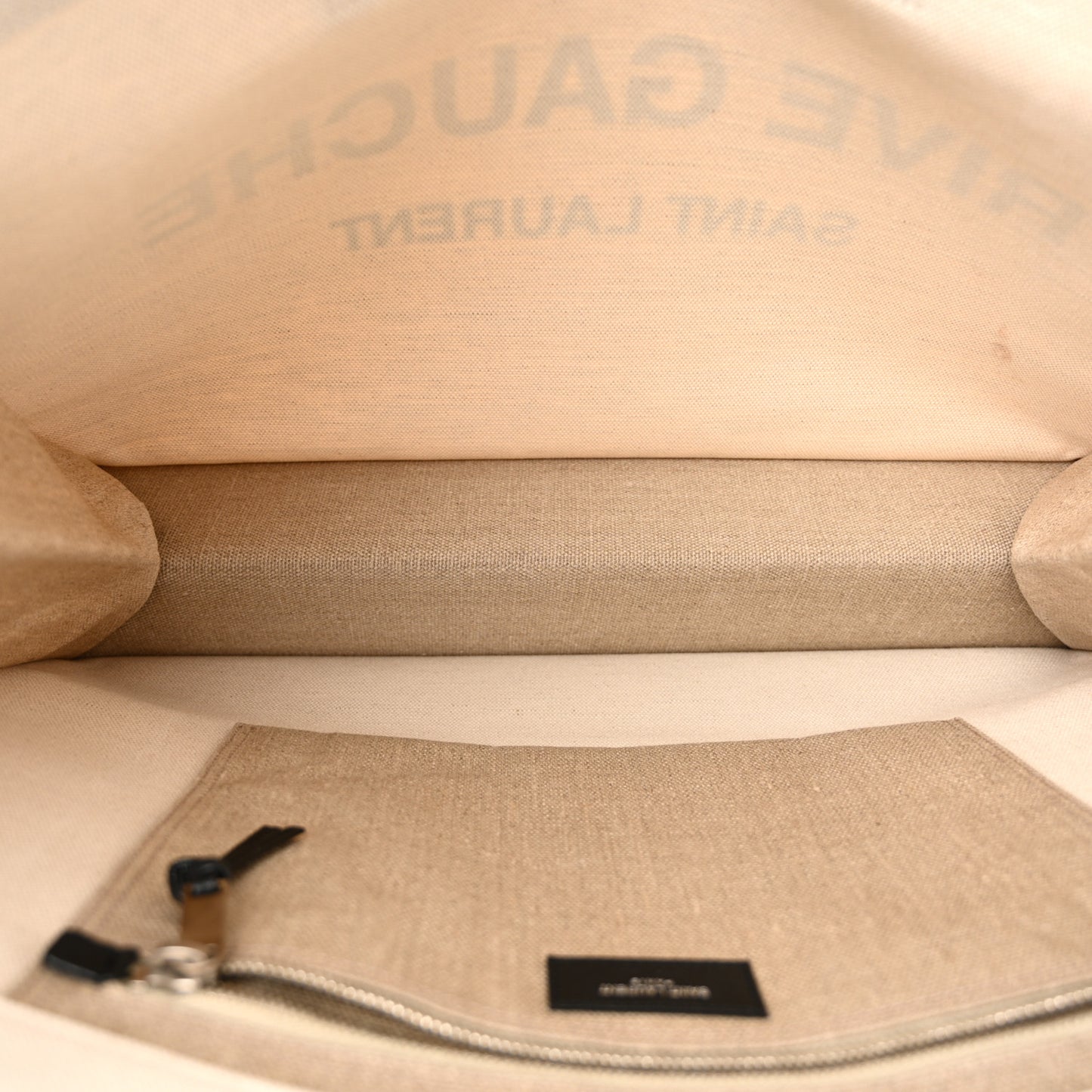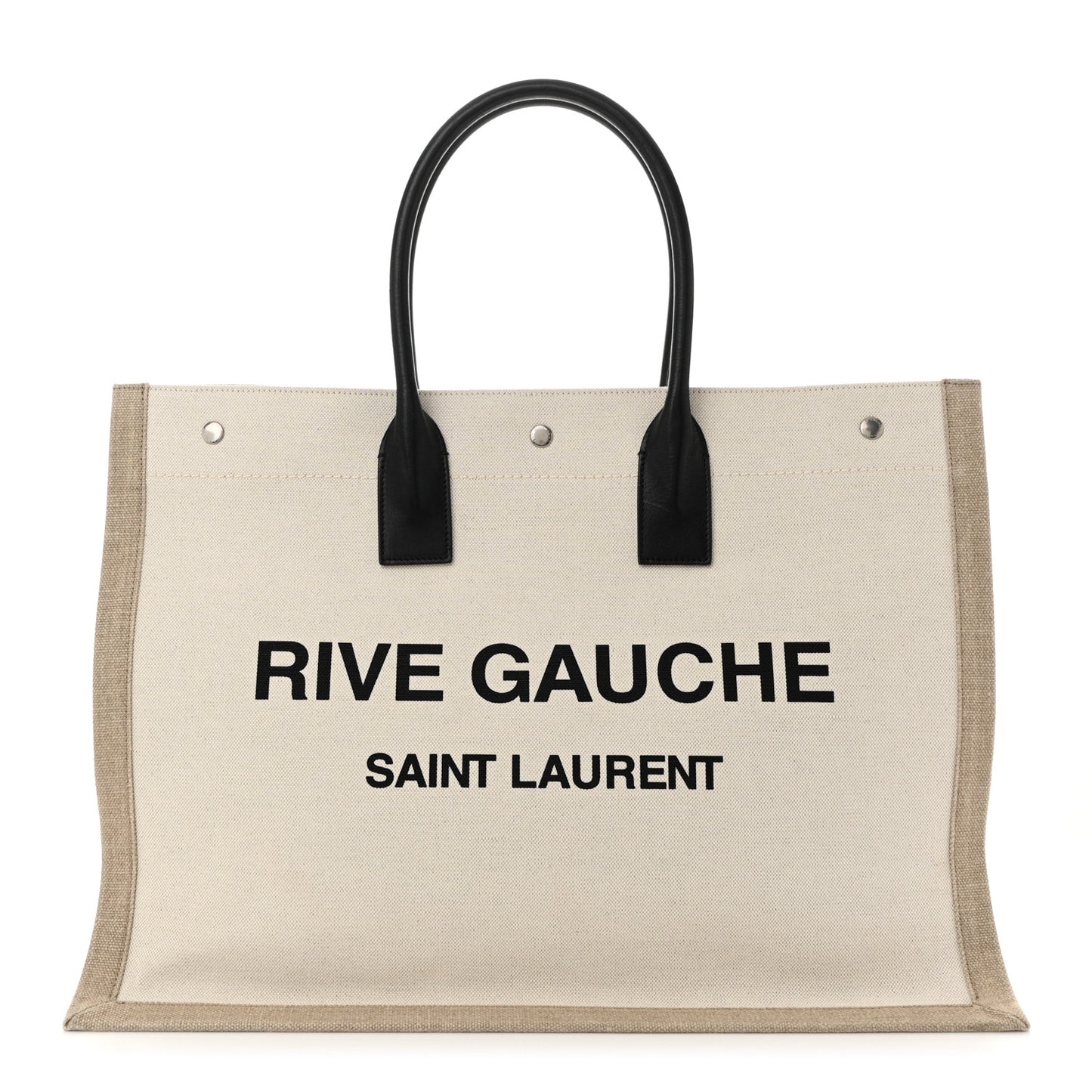 This is an authentic SAINT LAURENT Linen Calfskin Rive Gauche Tote in Optic White. This stylish tote is crafted of off-white linen with Rive Gauche, Saint Laurent printed across the front. The tote features tall black leather handles and opens to a spacious interior with a hanging zipper pocket.Follow this item for alerts. Saint Laurent is a registered trademark of Saint Laurent. FASHIONPHILE is not affiliated with Saint Laurent.