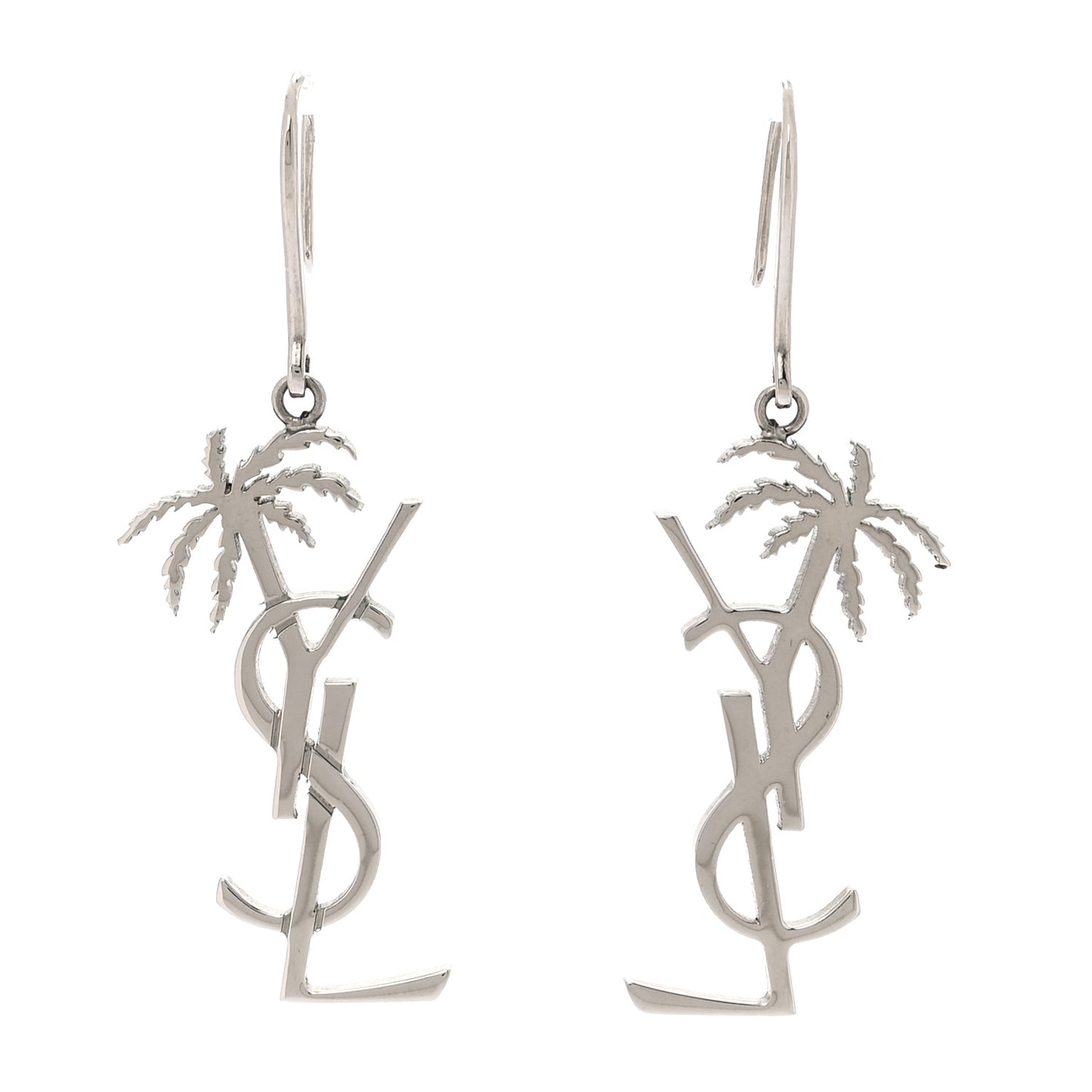 This is an authentic SAINT LAURENT Metal Monogram Palm Earrings in Silver. This stylish pair of earrings features a silver YSL logo and palm tree suspended at the lobe.Follow this item for alerts. Saint Laurent is a registered trademark of Saint Laurent. FASHIONPHILE is not affiliated with Saint Laurent.