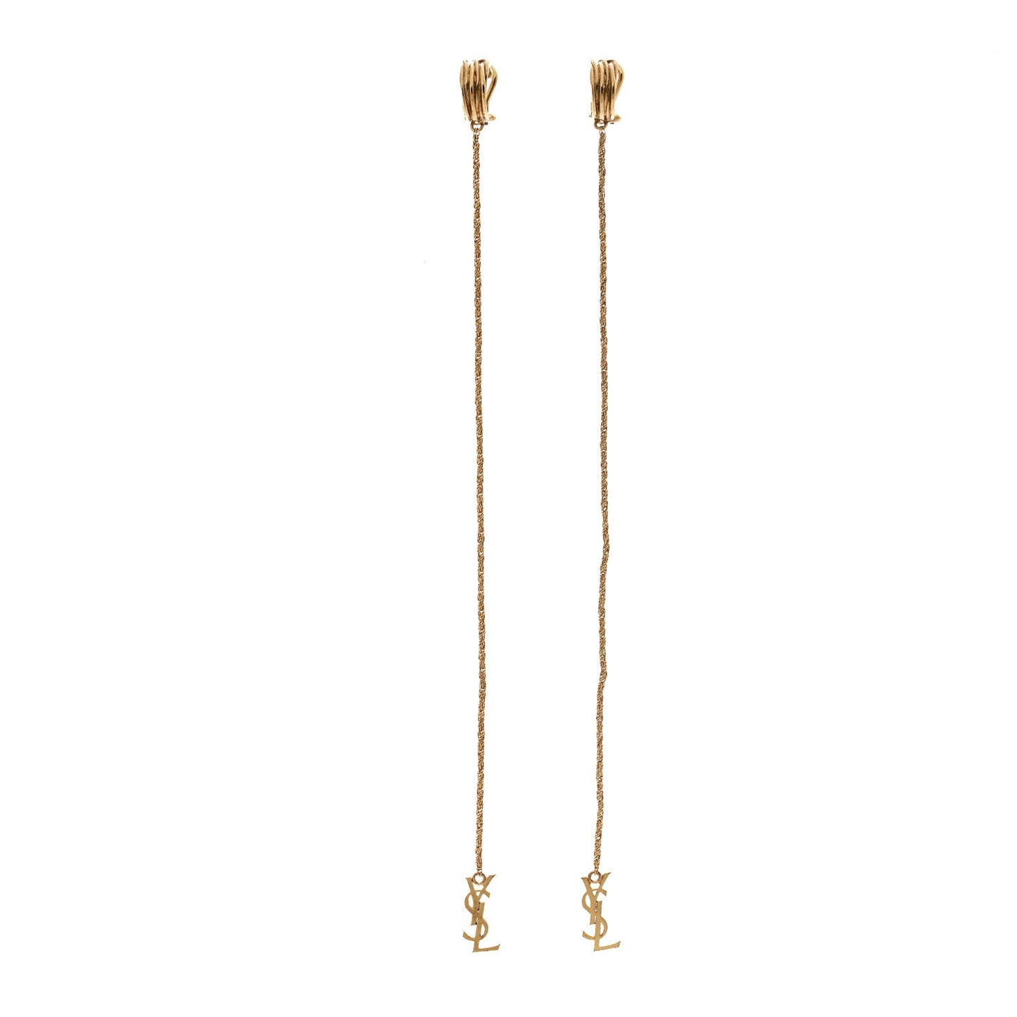 This is an authentic SAINT LAURENT Metal Opyum Clip On Drop Earrings in Gold. This stylish pair of earrings features a gold-toned YSL logo hanging on a long chain.Follow this item for alerts. Saint Laurent is a registered trademark of Saint Laurent. FASHIONPHILE is not affiliated with Saint Laurent.
