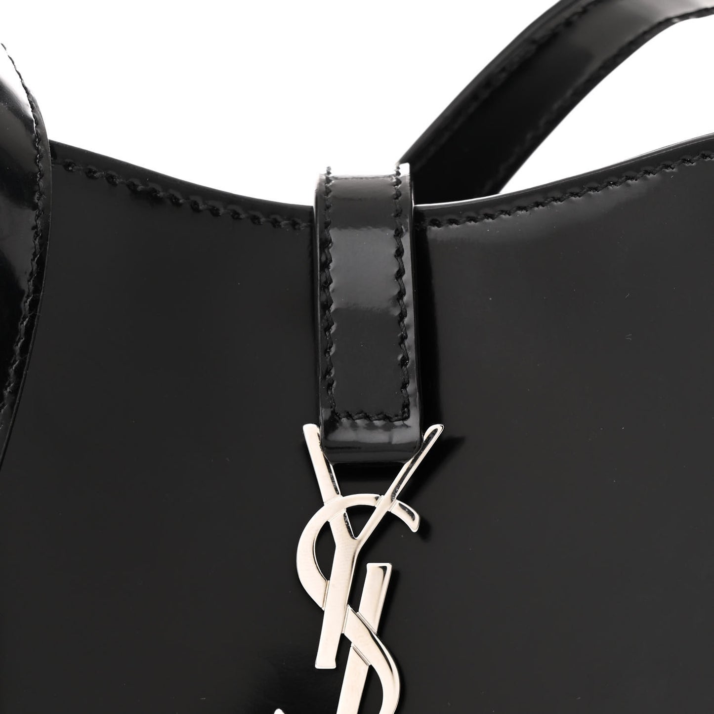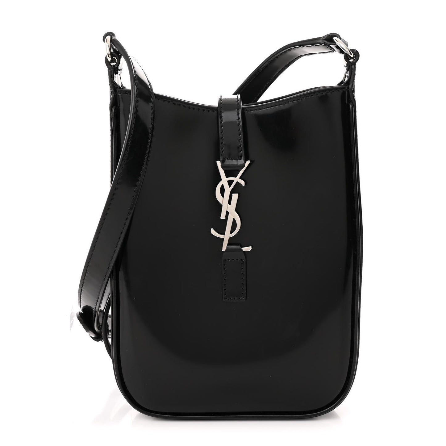 This is an authentic SAINT LAURENT Patent Calfskin Le 5 A 7 Mini Hobo in Black. This elegant shoulder bag is crafted of patent calfskin leather in black. The bag features looping shoulder strap. The front features a silver prominent YSL monogram crossbody strap that opens to a black suede leather interior.Follow this item for alerts. Saint Laurent is a registered trademark of Saint Laurent. FASHIONPHILE is not affiliated with Saint Laurent.