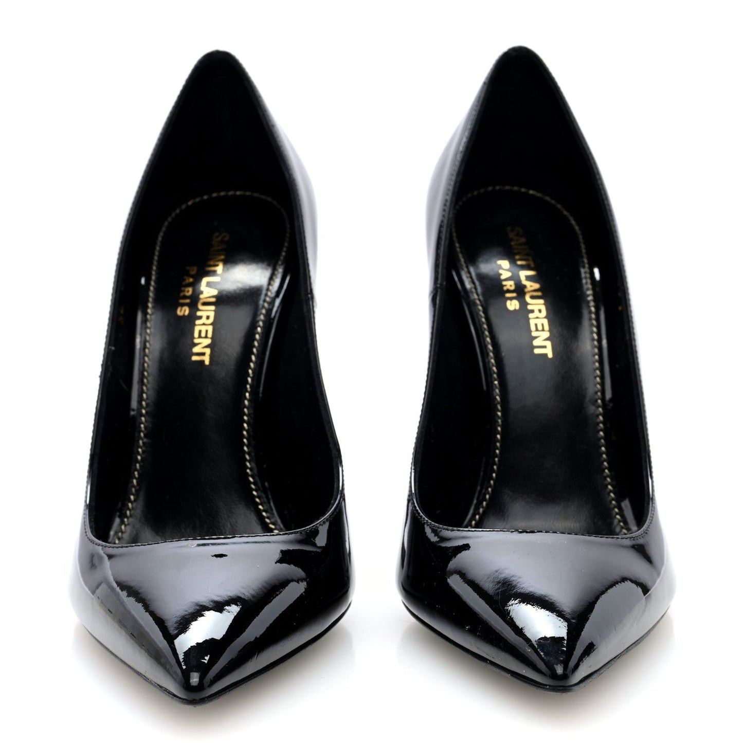 This is an authentic pair of SAINT LAURENT Patent Calfskin Opyum 110 Pumps size 36.5 in Black. These heels are crafted of black patent leather. They feature a pointed toe and a black 4.5-inch YSL logo heel.Follow this item for alerts. Saint Laurent is a registered trademark of Saint Laurent. FASHIONPHILE is not affiliated with Saint Laurent.