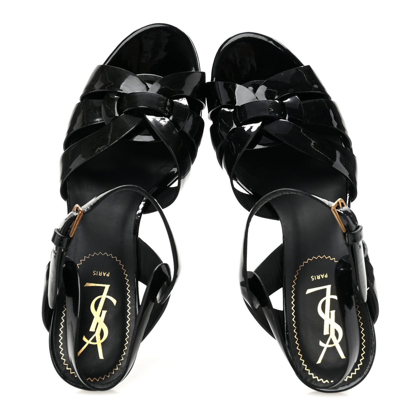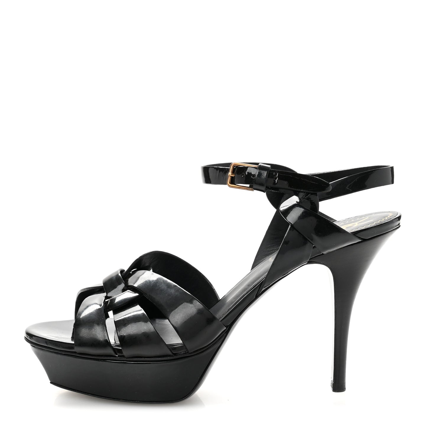 This is an authentic pair of SAINT LAURENT Patent Tribute 105 Platform Sandals size 38 in Black. These super-chic sandals are crafted of patent leather in black with brass hardware, a 1.25 inch wrapped leather platform and a 4-inch stiletto heel.Follow this item for alerts. Saint Laurent is a registered trademark of Saint Laurent. FASHIONPHILE is not affiliated with Saint Laurent.