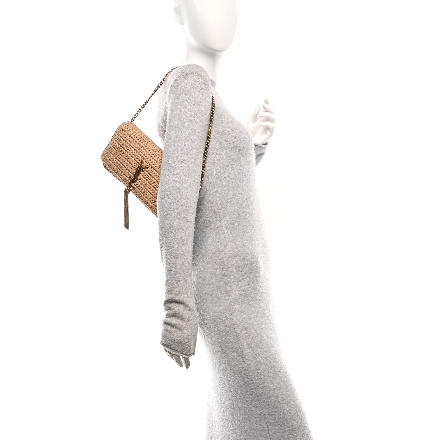 This is an authentic SAINT LAURENT Raffia Monogram Tassel Kate 99 in Dark Nude. This stylish bag is crafted of raffia in a dark beige. It features an interchangeable brown leather shoulder strap and gold chain strap. The front flap has a signature gold YSL logo with a hanging tasse that opens to a brown leather interior.Follow this item for alerts. Saint Laurent is a registered trademark of Saint Laurent. FASHIONPHILE is not affiliated with Saint Laurent.