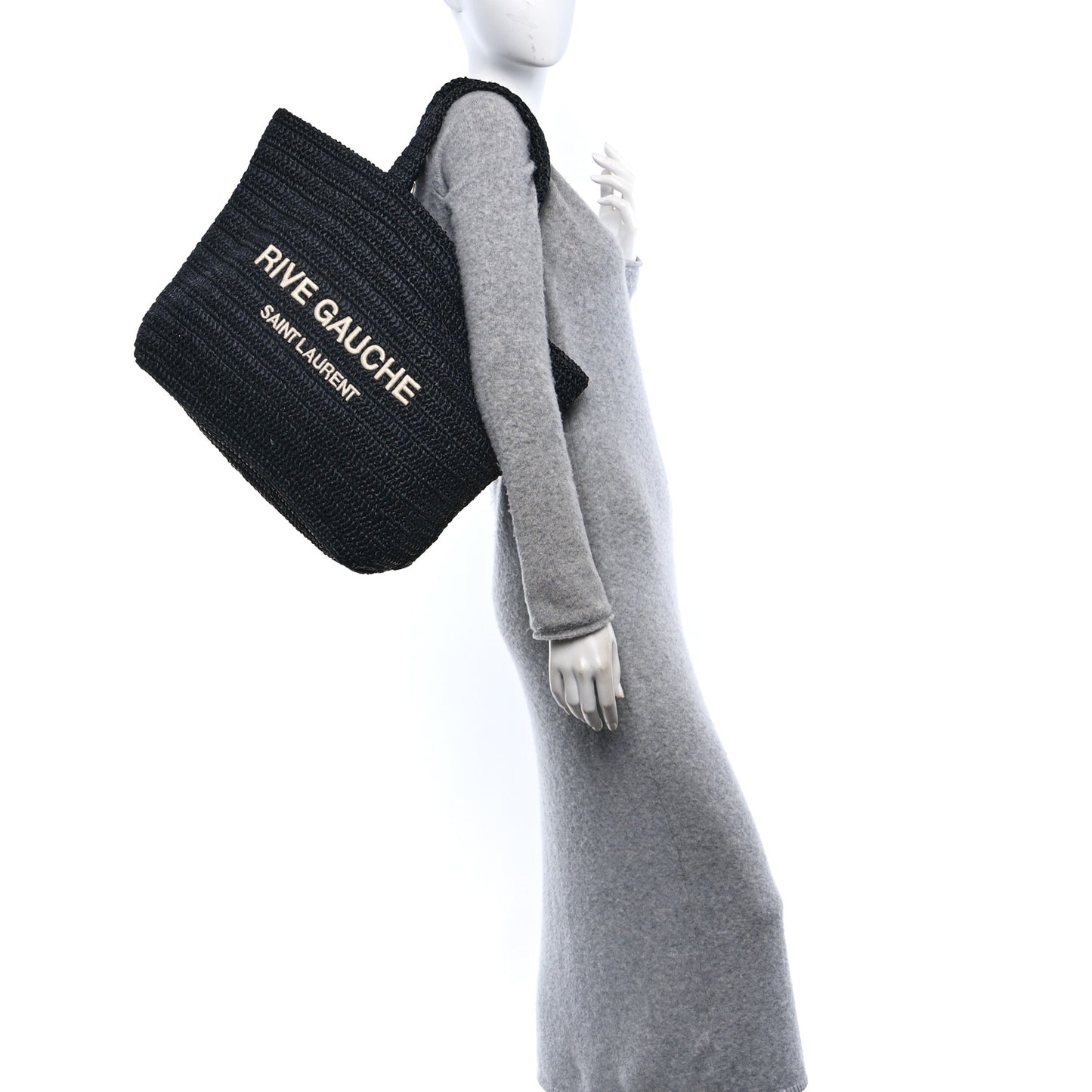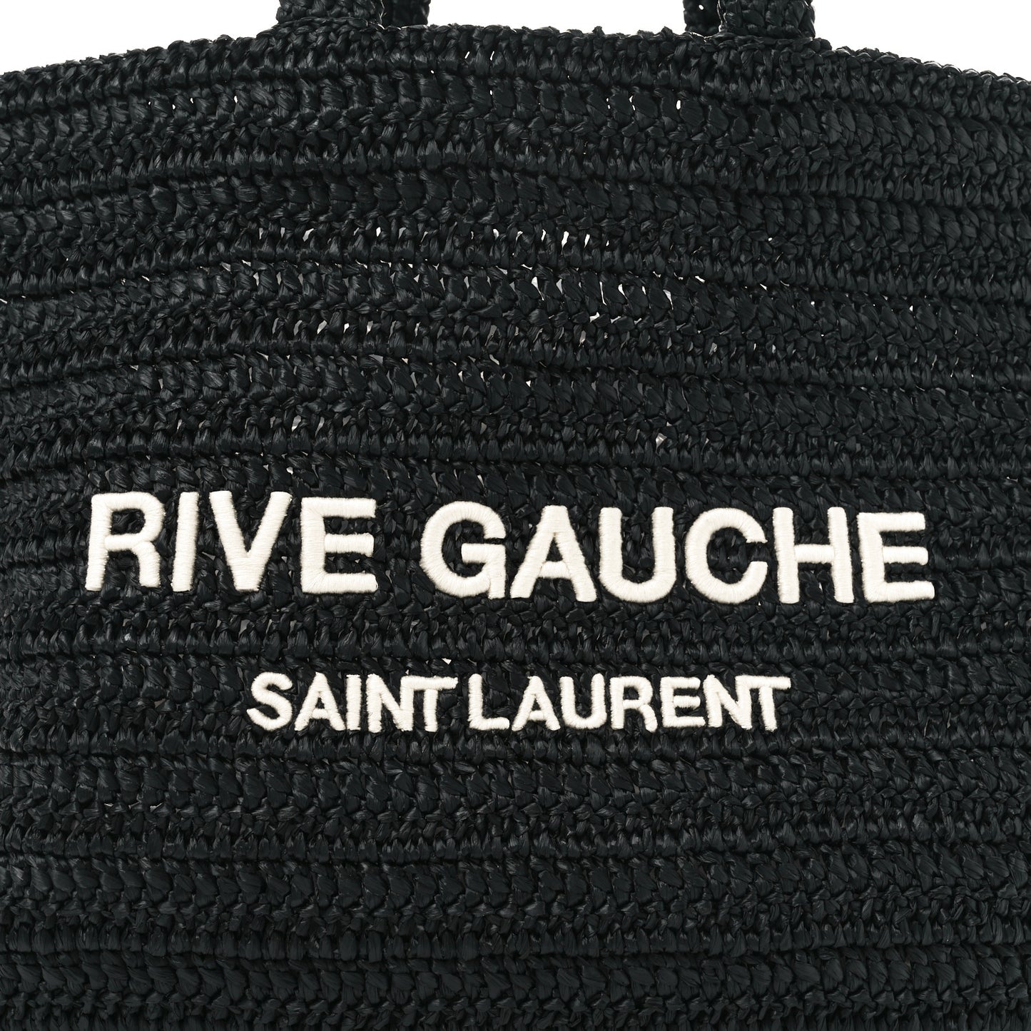 This is an authentic SAINT LAURENT Raffia Rive Gauche Tote in Black. This tote is crafted of black raffia with Rive Gauche, Saint Laurent embroidered across the front in off-white. The top is open to an unlined interior.Follow this item for alerts. Saint Laurent is a registered trademark of Saint Laurent. FASHIONPHILE is not affiliated with Saint Laurent.