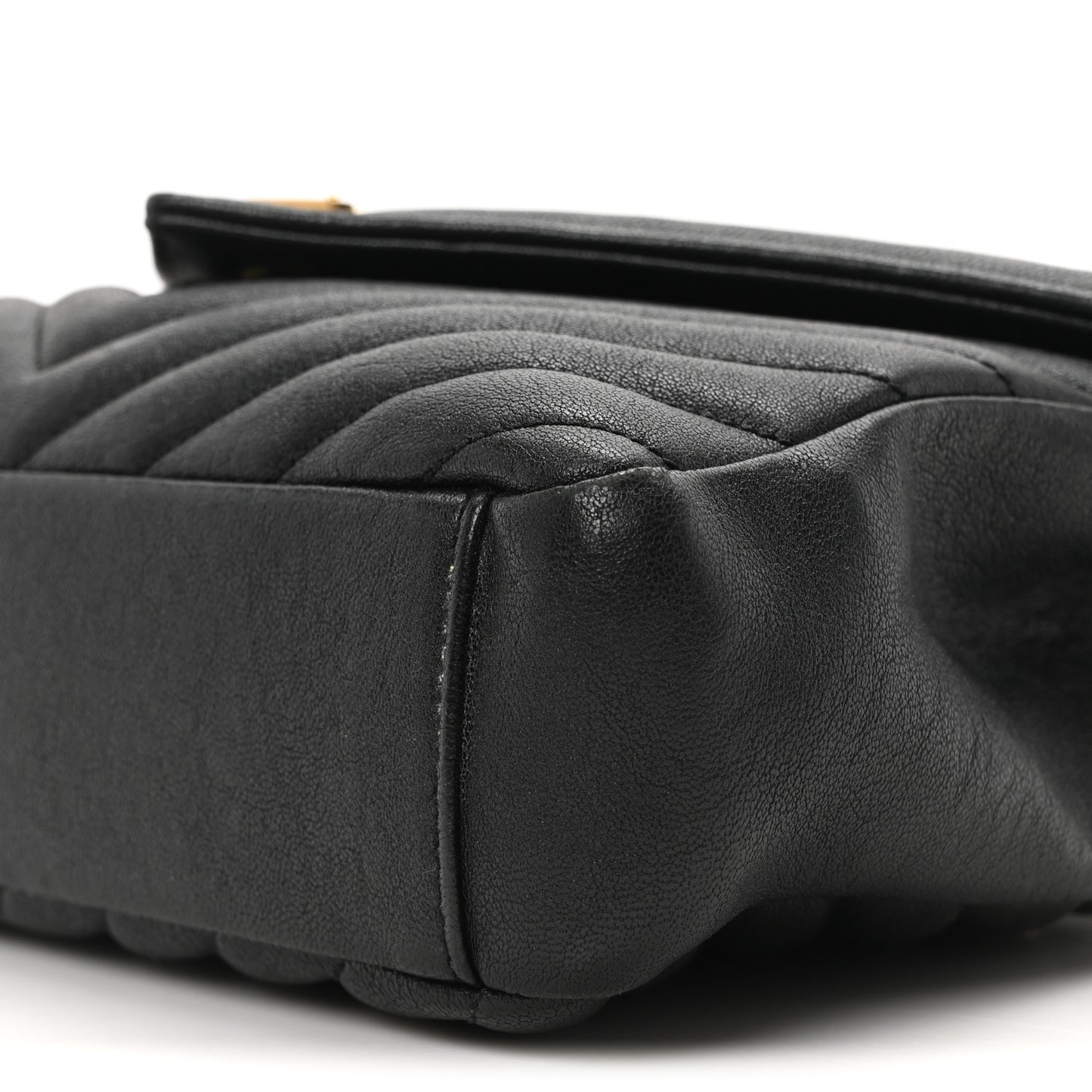 This is an authentic SAINT LAURENT Sheepskin Matelasse Chevron Monogram Medium College Bag in Black. This elegant shoulder bag features chic chevron quilted sheepskin leather in black. The bag has an optional aged gold chain-link shoulder strap with a leather shoulder pad and leather top handle. The frontal flap features a prominent aged gold YSL monogram detail and opens to a partitioned black fabric and leather interior with a patch pocket and a central zippered pocket.Follow this item for alerts. Saint Laurent is a registered trademark of Saint Laurent. FASHIONPHILE is not affiliated with Saint Laurent.