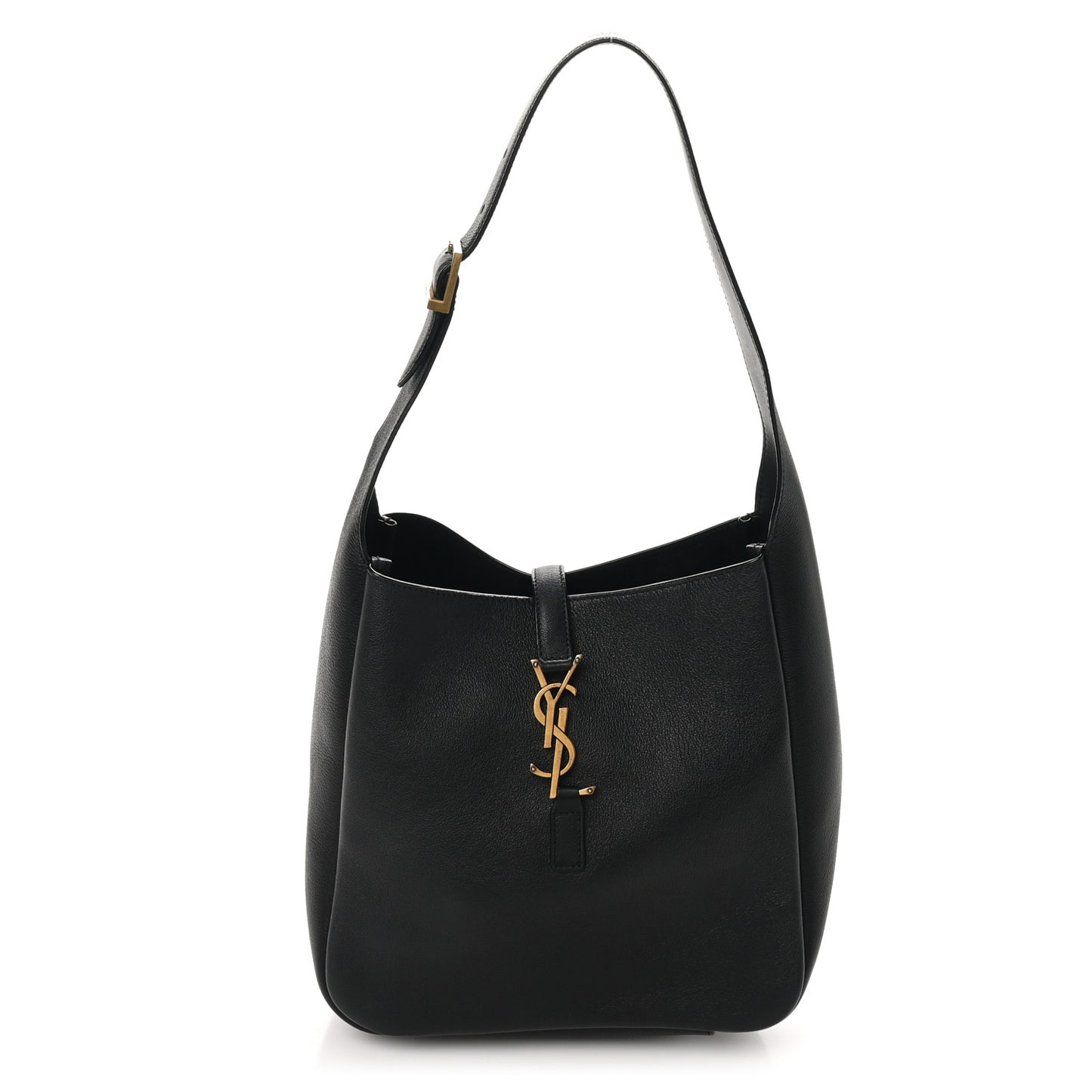 This is an authentic SAINT LAURENT Smooth Calfskin Small Le 5 A 7 Soft Hobo in Black. The hobo bag is classically structured and is crafted of luxurious black leather. It features a looping adjustable shoulder strap and a crossover strap with a gold YSL logo to latch the bag closed. The top of the bag is open to a black suede interior with a zipper pocket that creates a patch pocket.Follow this item for alerts. Saint Laurent is a registered trademark of Saint Laurent. FASHIONPHILE is not affiliated with Saint Laurent.