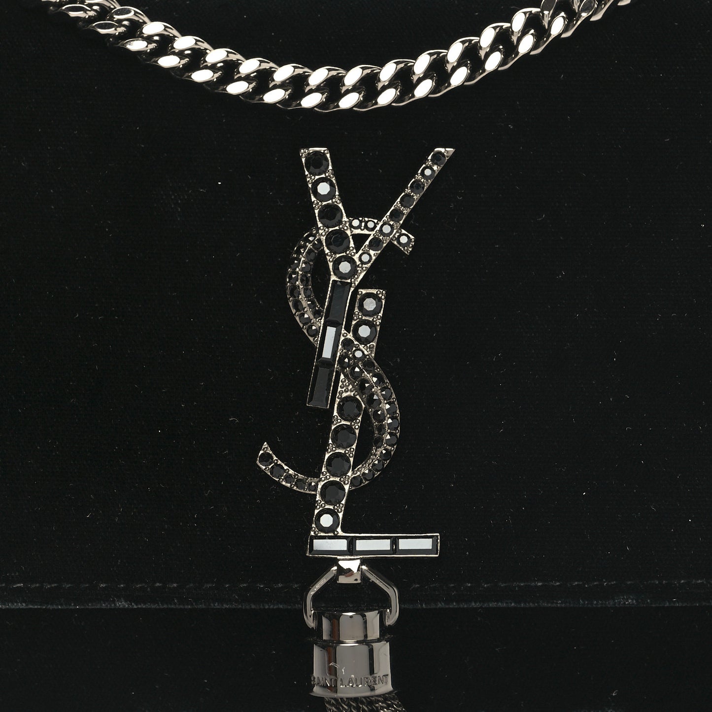 This is an authentic SAINT LAURENT Velvet Crystal Monogram Kate Tassel Chain Wallet in Black. This stunning small shoulder bag is crafted of velvet in black. The bag features a black chain link cross-body shoulder strap along with a facing flap with a black YSL logo encrusted with black crystals and a knobbed miniature chain tassel. The flap opens to a black leather interior with a patch pocket.Follow this item for alerts. Saint Laurent is a registered trademark of Saint Laurent. FASHIONPHILE is not affiliated with Saint Laurent.