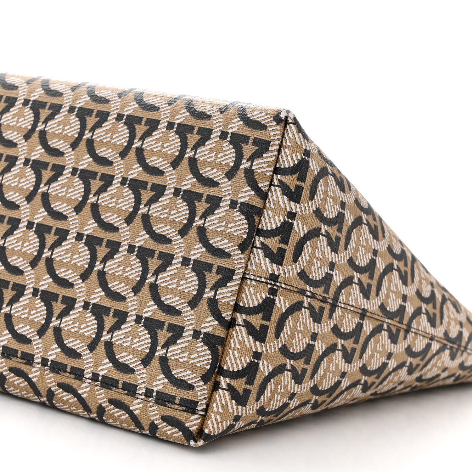 This is an authentic SALVATORE FERRAGAMO Canvas Calfskin Gancini Bag in Black. This chic tote is crafted of beige coated canvas with black and white print overlay. The bag features a leather strap handles and a signature gold gancini lock. The flap opens to a black fabric interior with a red leather removable pouch.Follow this item for alerts. Salvatore Ferragamo is a registered trademark of Salvatore Ferragamo. FASHIONPHILE is not affiliated with Salvatore Ferragamo.