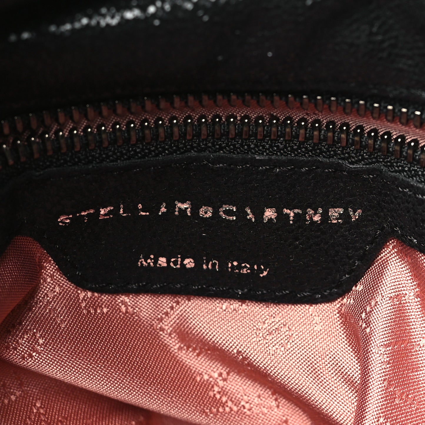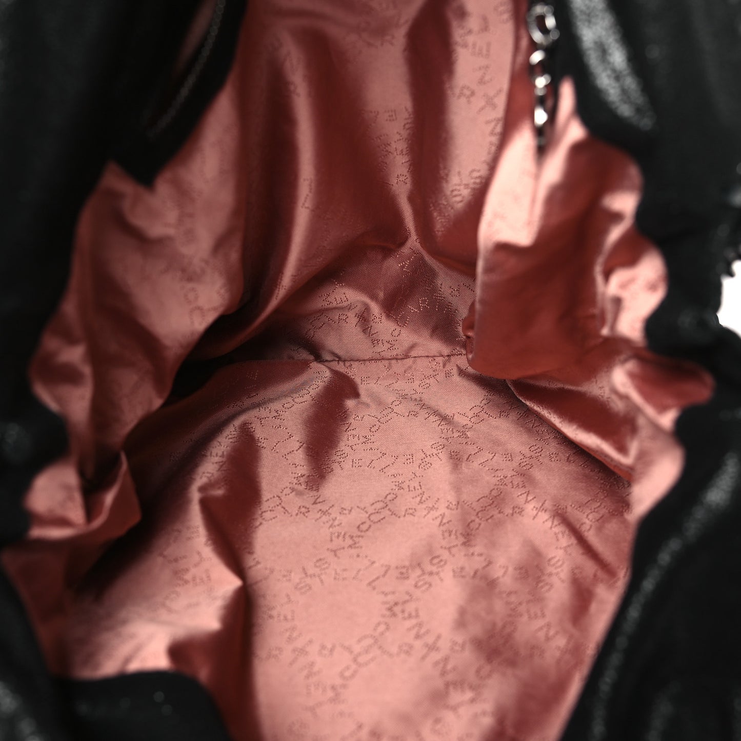 This is an authentic STELLA MCCARTNEY Shaggy Deer Falabella Fold Over Tote in Black. This stylish shoulder bag is crafted of animal-friendly faux leather in black. The bag is bordered with polished silver chain links that extent to the top handles and shoulder strap. The top opens with a magnet to a rose fabric interior with a zipper pocket.Follow this item for alerts. Stella McCartney is a registered trademark of Stella McCartney. FASHIONPHILE is not affiliated with Stella McCartney.