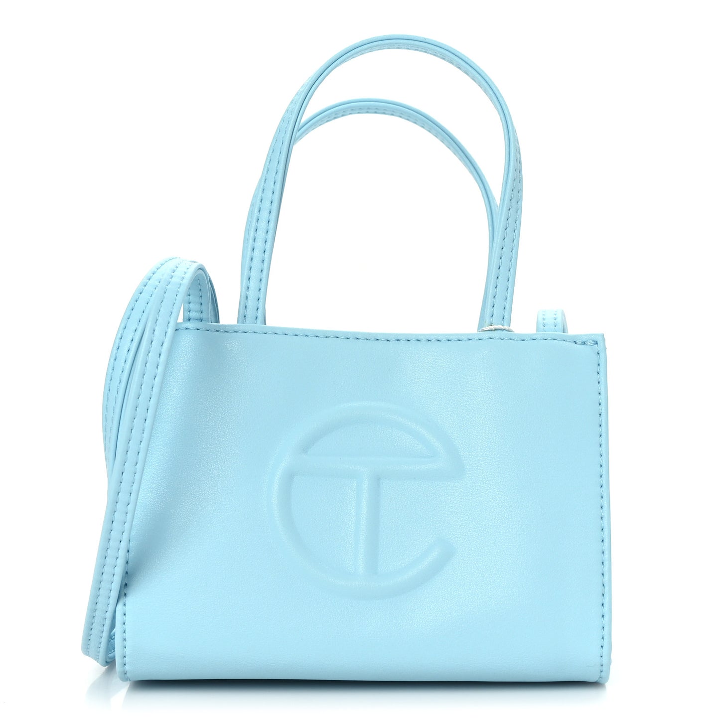 This is an authentic TELFAR Vegan Leather Small Shopping Bag in Pool Blue. This mini tote is constructed of faux leather in light blue with the iconic raised Telfar logo at the front. The shoulder bag has thin blue handles and a long crossbody strap. The bag opens to a blue fabric interior.Follow this item for alerts. Telfar is a registered trademark of Telfar. FASHIONPHILE is not affiliated with Telfar.