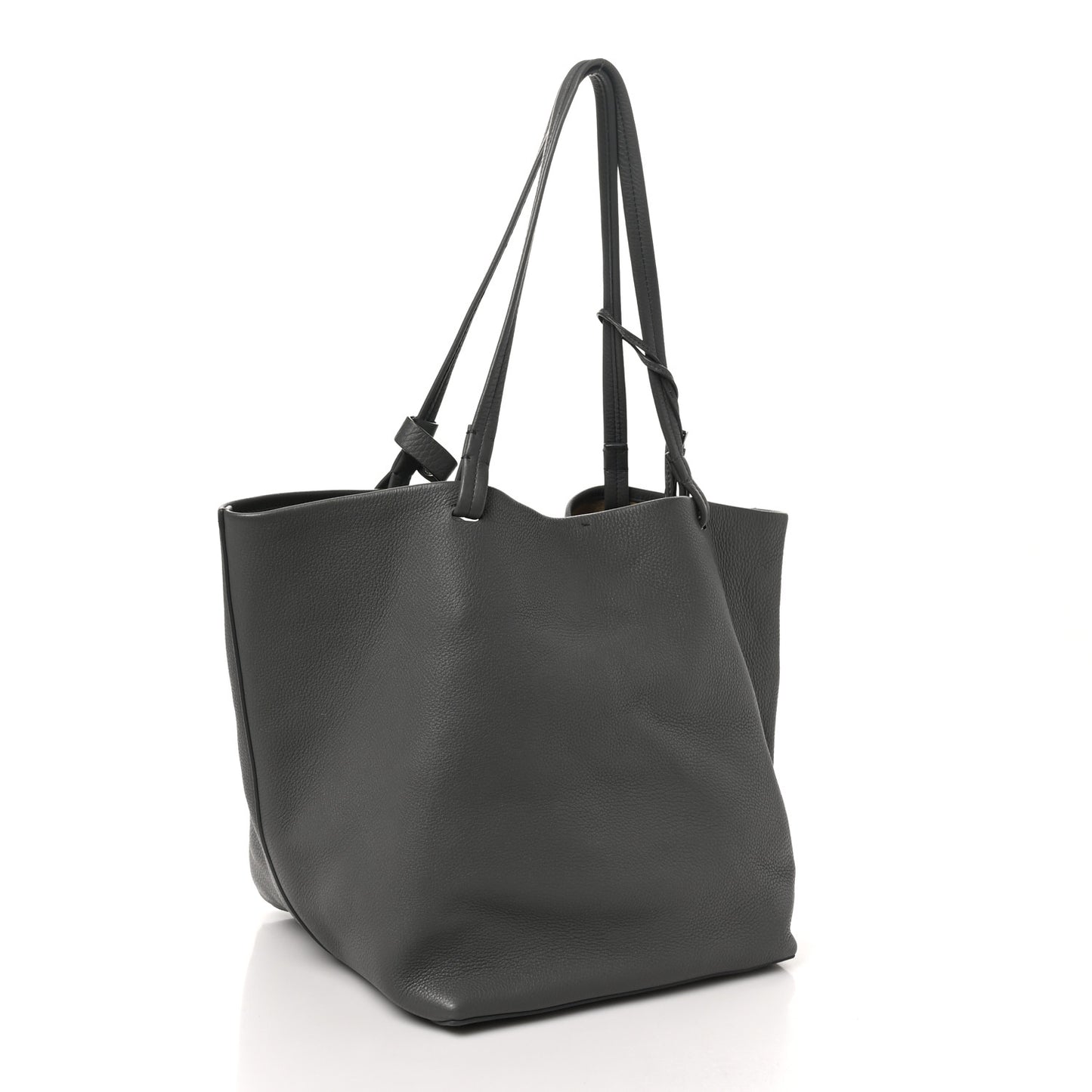 This is an authentic THE ROW Grained Calfskin Park Tote Three in Charcoal. This stylish tote bag is made of gray grained calfskin leather. The tote features flat handles and an open top with grey suede lining.Follow this item for alerts. The Row is a registered trademark of The Row. FASHIONPHILE is not affiliated with The Row.