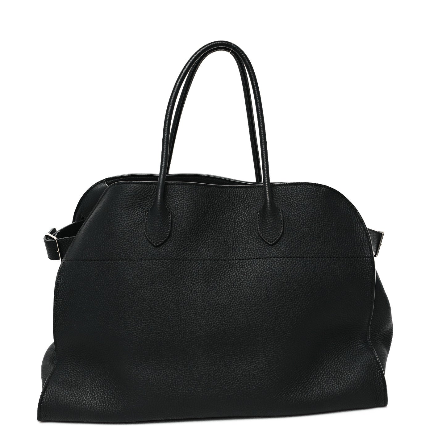 This is an authentic THE ROW Grained Calfskin Soft Margaux 17 in Black. This bag is crafted of black grained calfskin leather. It features rolled leather top handles and silver hardware. The open top leads to a fabric interior with zipper and patch pockets.Follow this item for alerts. The Row is a registered trademark of The Row. FASHIONPHILE is not affiliated with The Row.