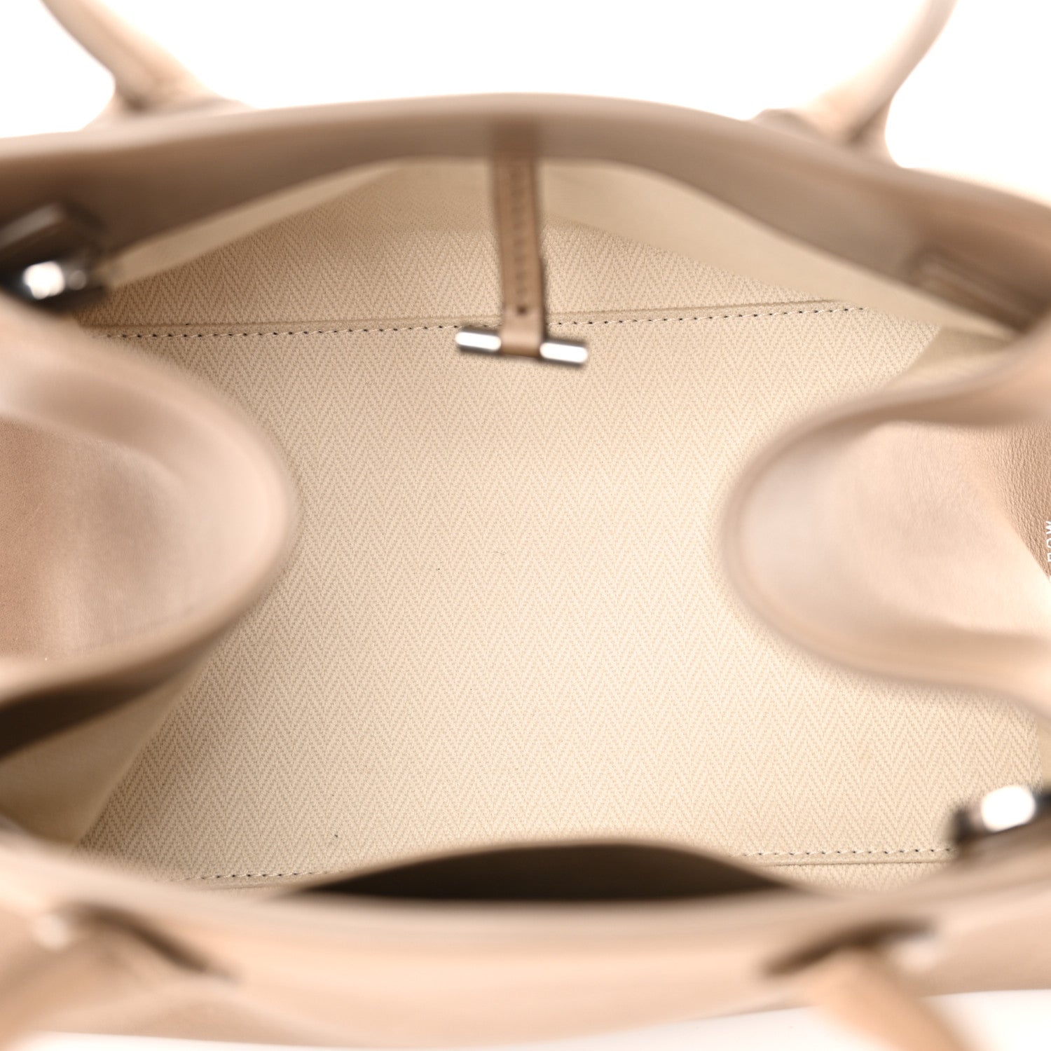 This is an authentic THE ROW Polished Saddle Calfskin Soft Margaux 10 Bag in Mouse Grey. This handbag is crafted of luxuriously calfskin leather in a taupe grey. The shoulder bag features leather buckle straps for width adjustment, an optional leather shoulder strap, silver hardware, and rolled leather top handles attached to a wide-open top, revealing an off white herringbone textile interior with a hanging pocket.Follow this item for alerts. The Row is a registered trademark of The Row. FASHIONPHILE is not affiliated with The Row.