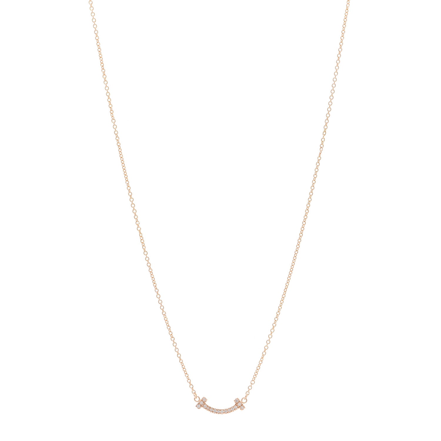 This is an authentic TIFFANY 18K Rose Gold Diamond Mini T Smile Pendant Necklace. The necklace is crafted of 18 karat rose gold and features a T smile motif set with sparkling diamonds, approximately .03 total carat weight.Follow this item for alerts. Tiffany is a registered trademark of Tiffany. FASHIONPHILE is not affiliated with Tiffany.