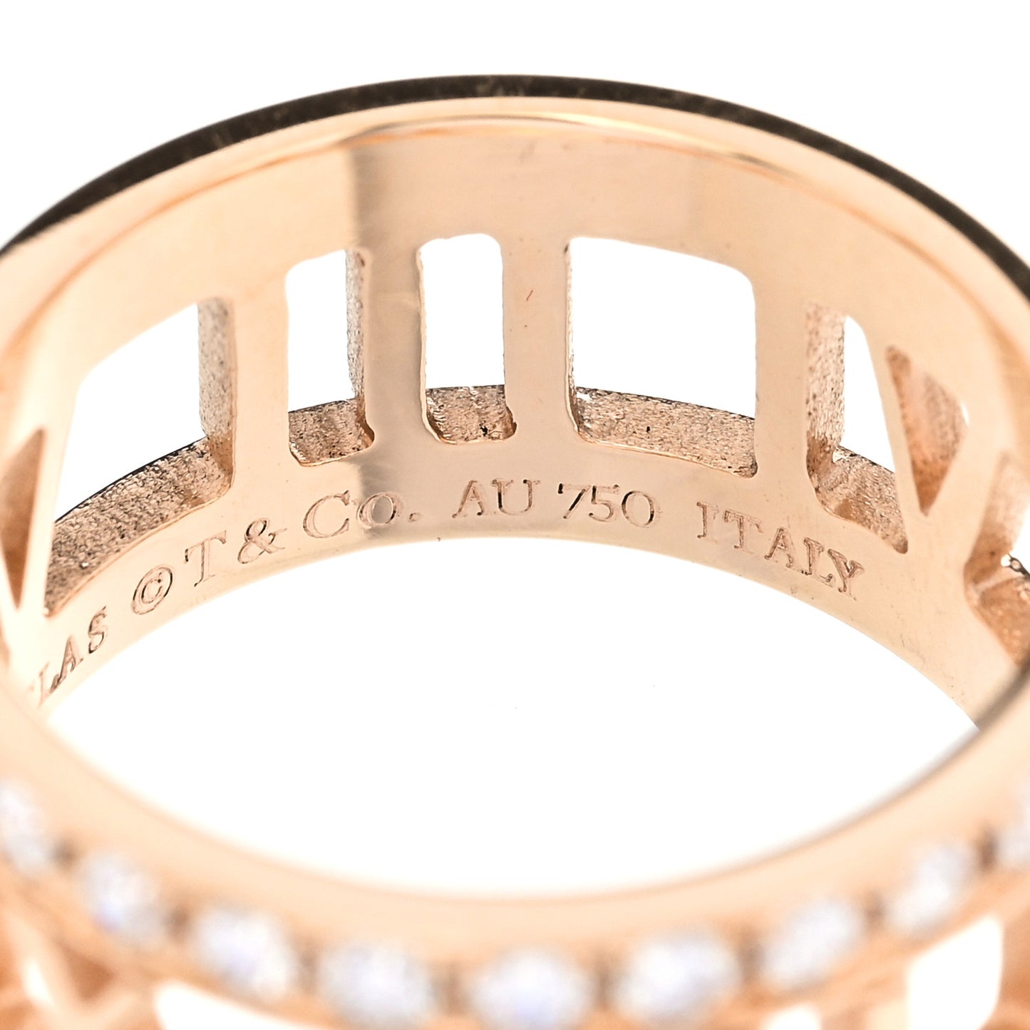 This is an authentic TIFFANY 18K Rose Gold Diamond Wide Atlas Open Ring size 48 or 4.5. The ring is crafted of 18 karat rose gold into a laser cut open Roman numeral band with diamond details along the edges of half the band weighing approximately .52 total carat weight.Follow this item for alerts. Tiffany is a registered trademark of Tiffany. FASHIONPHILE is not affiliated with Tiffany.