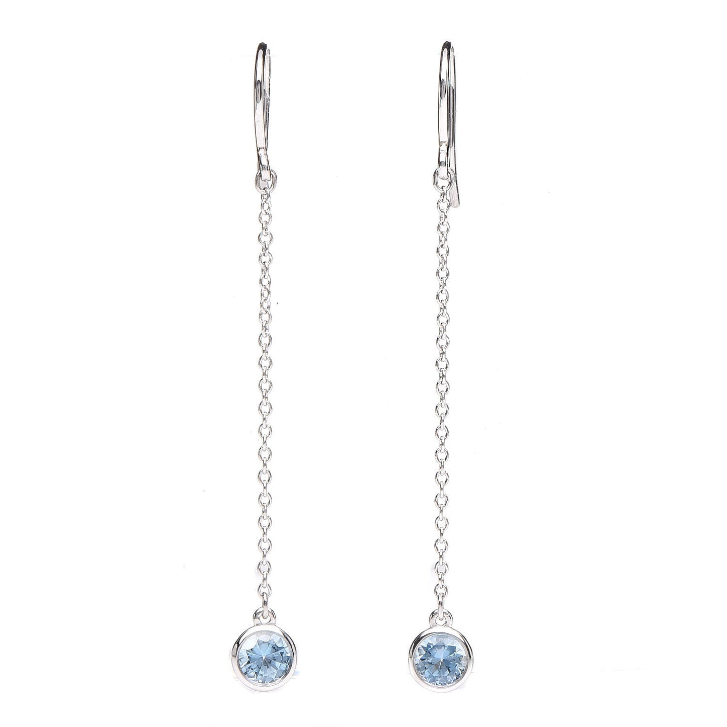 These are authentic TIFFANY Platinum Aquamarine .10ct Color By The Yard Drop Earrings. These lovely earrings are crafted of platinum and feature two round aquamarine stones weighing approximately .10 total carat weight. These are beautiful earrings with the unforgettable style of Tiffany!Follow this item for alerts. Tiffany is a registered trademark of Tiffany. FASHIONPHILE is not affiliated with Tiffany.