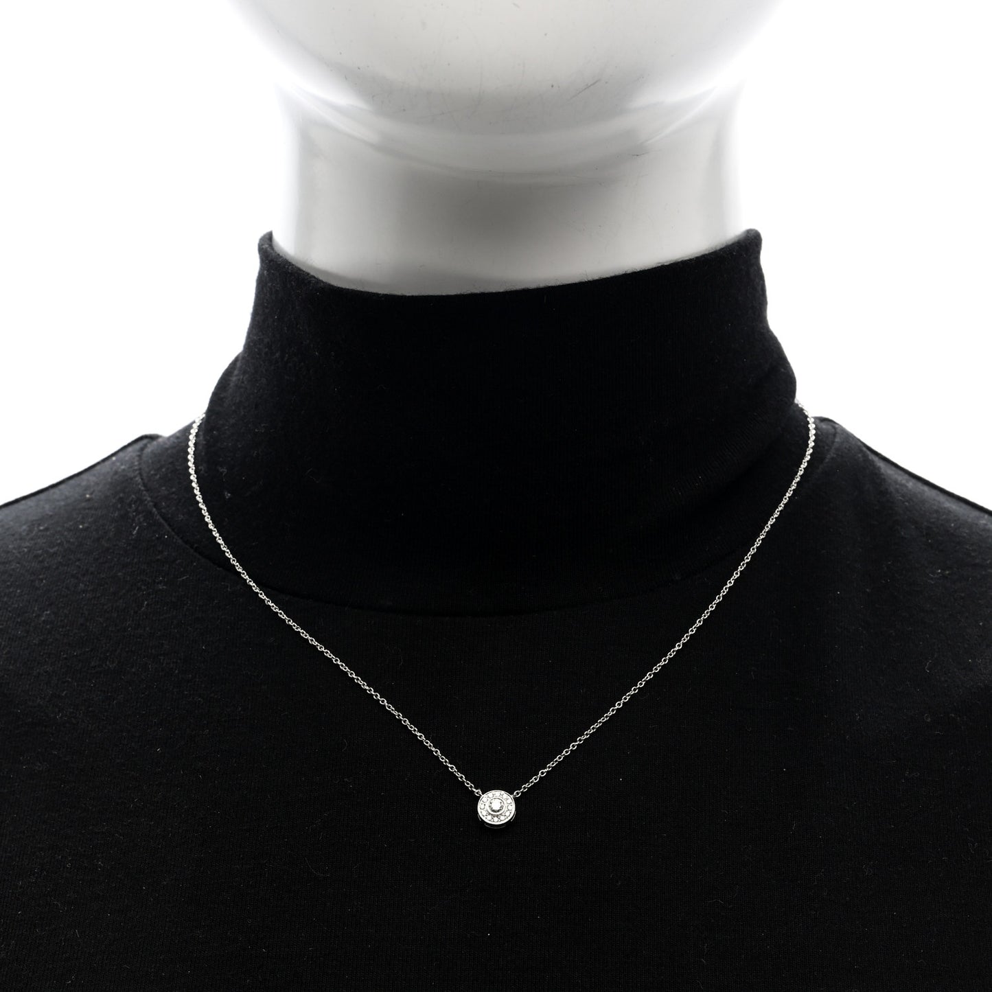This is an authentic TIFFANY Platinum Diamond Soleste Pendant Necklace. The necklace is crafted of platinum and features a polished chain and a round station pendant pave-set with diamonds framing a round brilliant cut center diamond, approximately .16 total carat weight.Follow this item for alerts. Tiffany is a registered trademark of Tiffany. FASHIONPHILE is not affiliated with Tiffany.