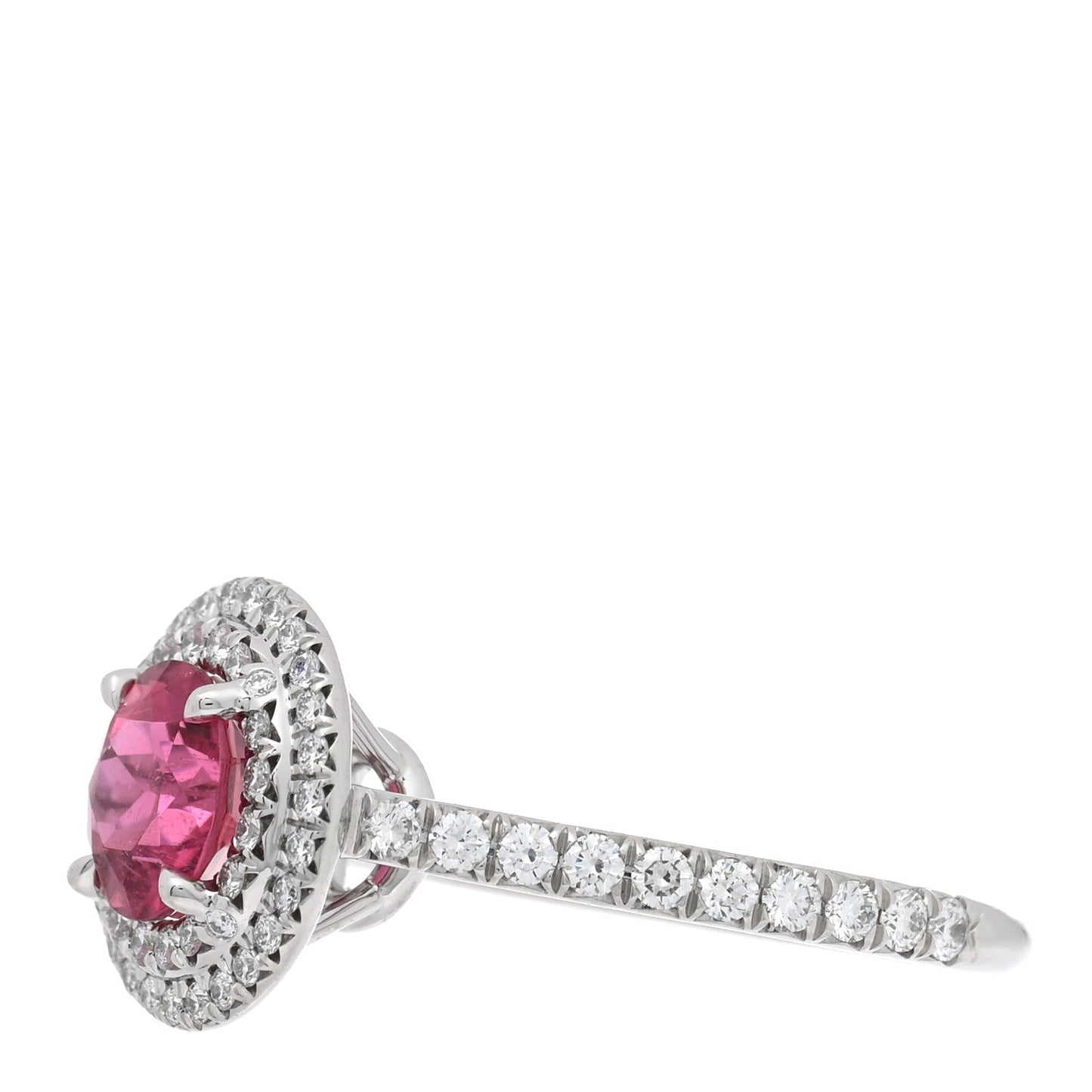 This is an authentic TIFFANY Platinum Diamond Ruby Soleste Ring 49 5. The ring is crafted of platinum and features a round brilliant cut ruby with approximately .36 total carat weight of pave-set diamonds.Follow this item for alerts. Tiffany is a registered trademark of Tiffany. FASHIONPHILE is not affiliated with Tiffany.