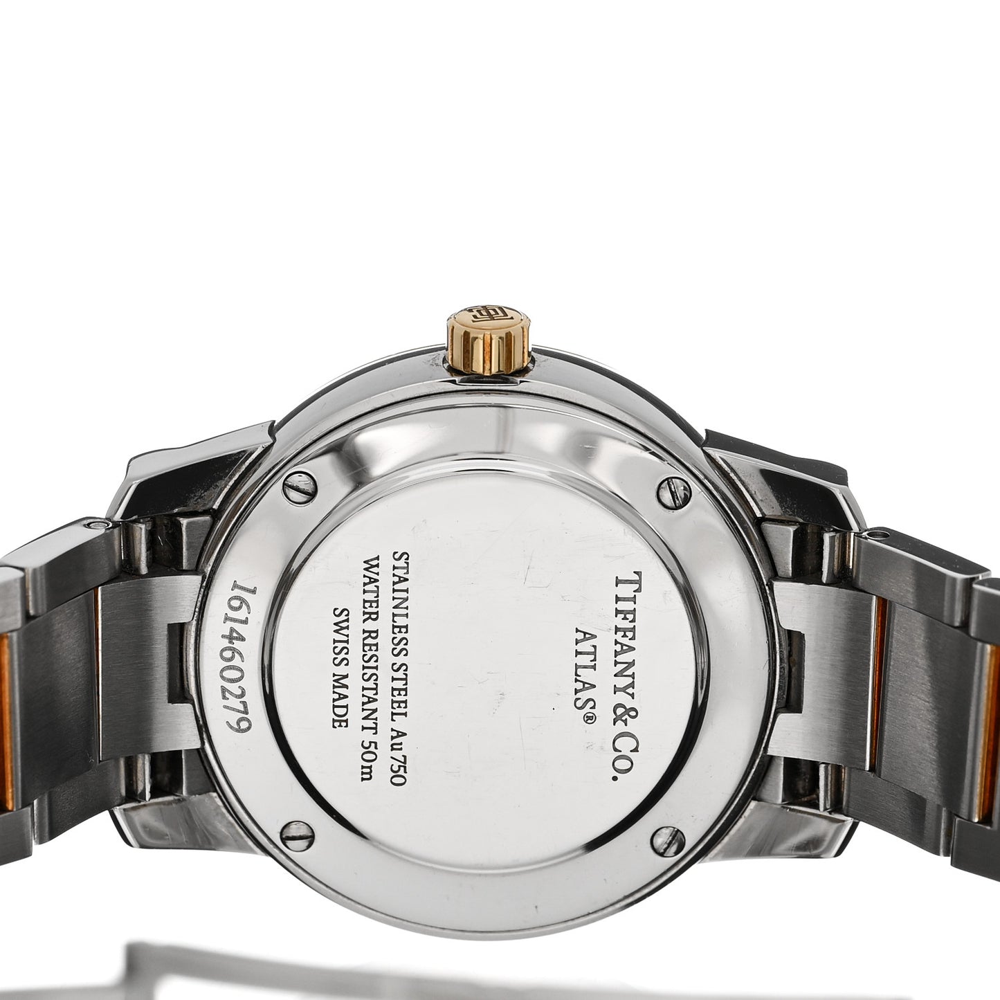 This is an authentic TIFFANY Stainless Steel 18K Yellow Gold 29mm Atlas 2-Hand Quartz Watch. The watch is crafted of stainless steel and 18 karat yellow gold, and features a white dial with Roman numeral hour markers, date window, sapphire crystal, two tone bracelet with a double deployment clasp, and a quartz movement.Follow this item for alerts. Tiffany is a registered trademark of Tiffany. FASHIONPHILE is not affiliated with Tiffany.