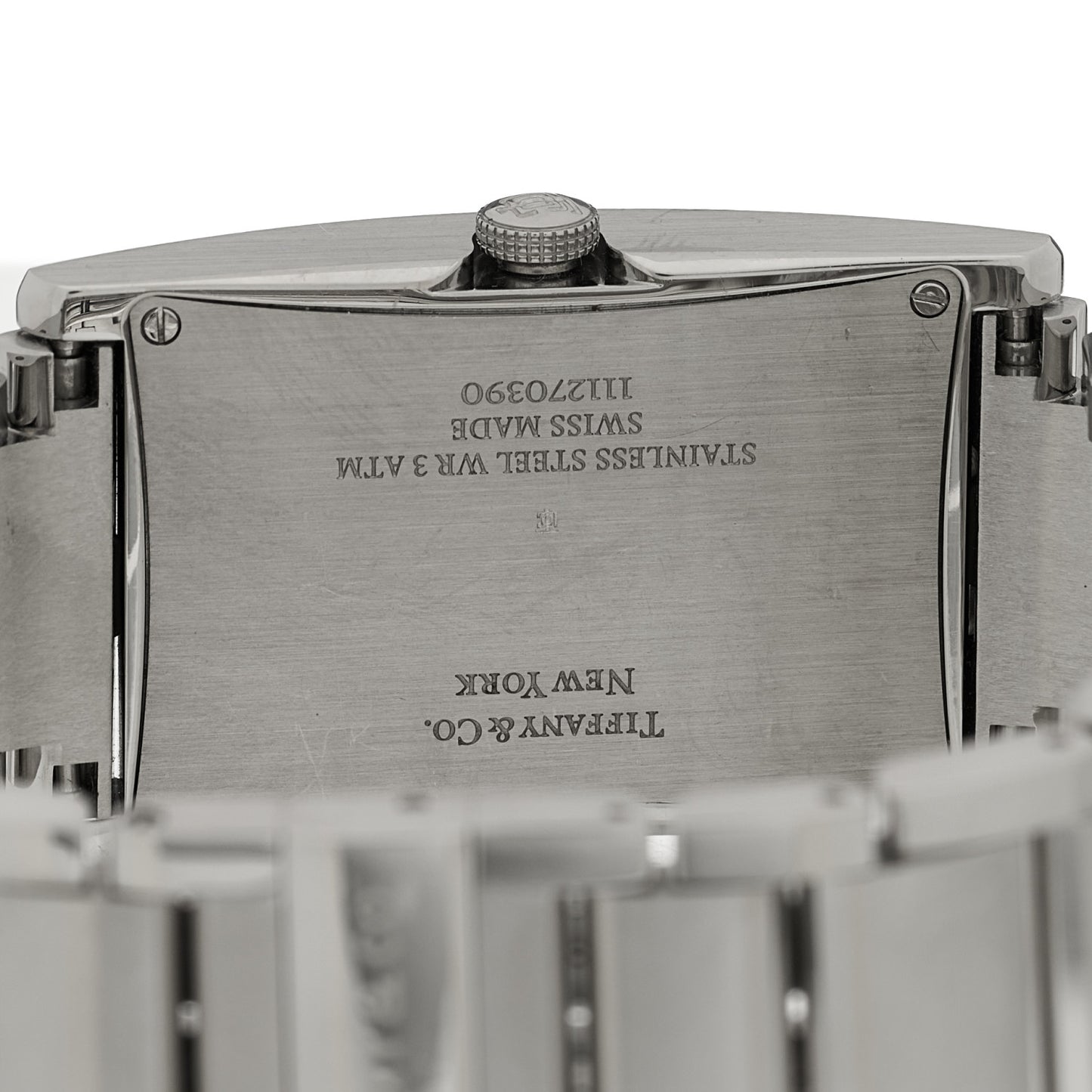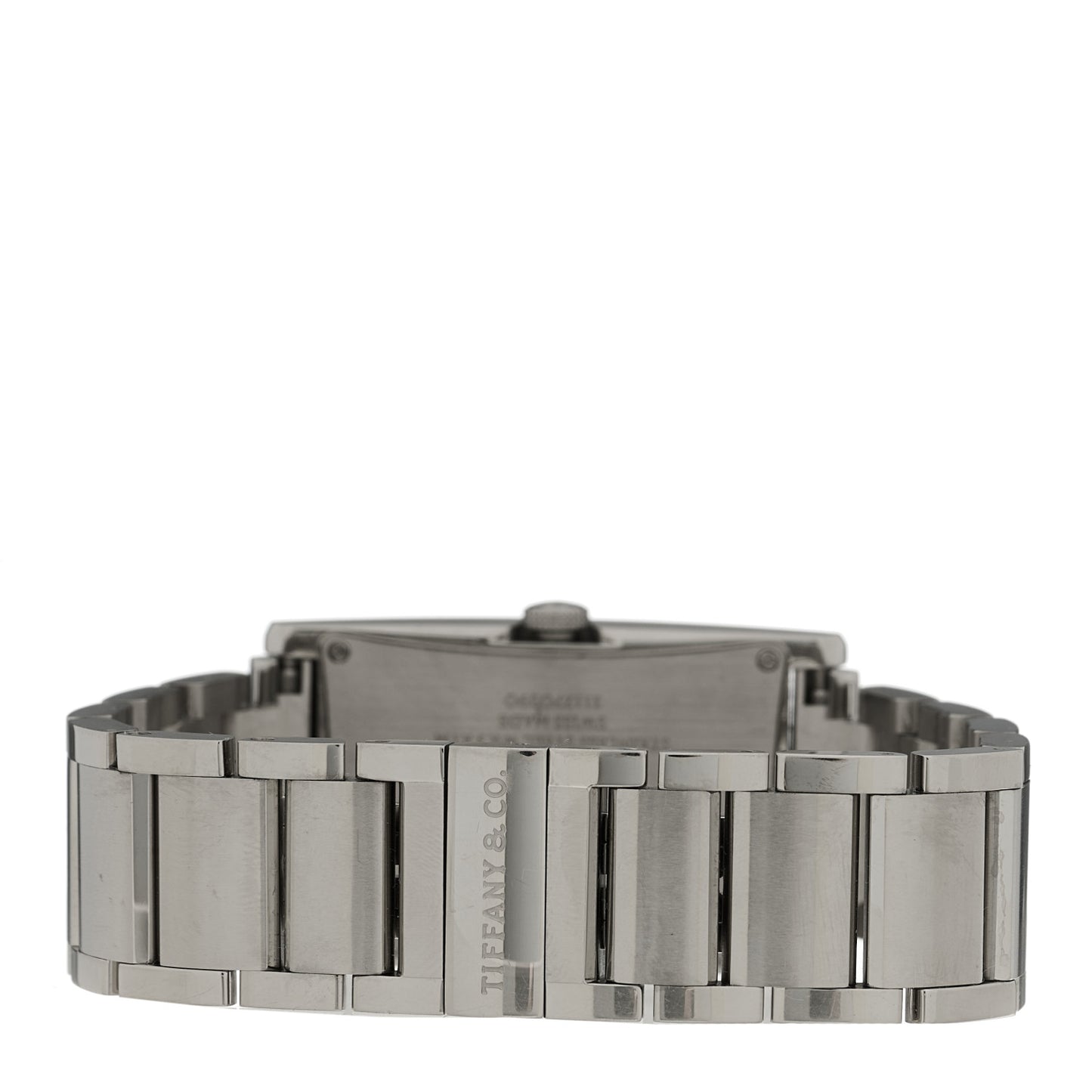 This is an authentic TIFFANY Stainless Steel Diamond Bezel 25mm East West Quartz Watch White. The watch is crafted of stainless steel and features an "east/west" facing dial in white, Arabic numeral hour markers, diamond bezel, sapphire crystal, and a quartz movement.Follow this item for alerts. Tiffany is a registered trademark of Tiffany. FASHIONPHILE is not affiliated with Tiffany.
