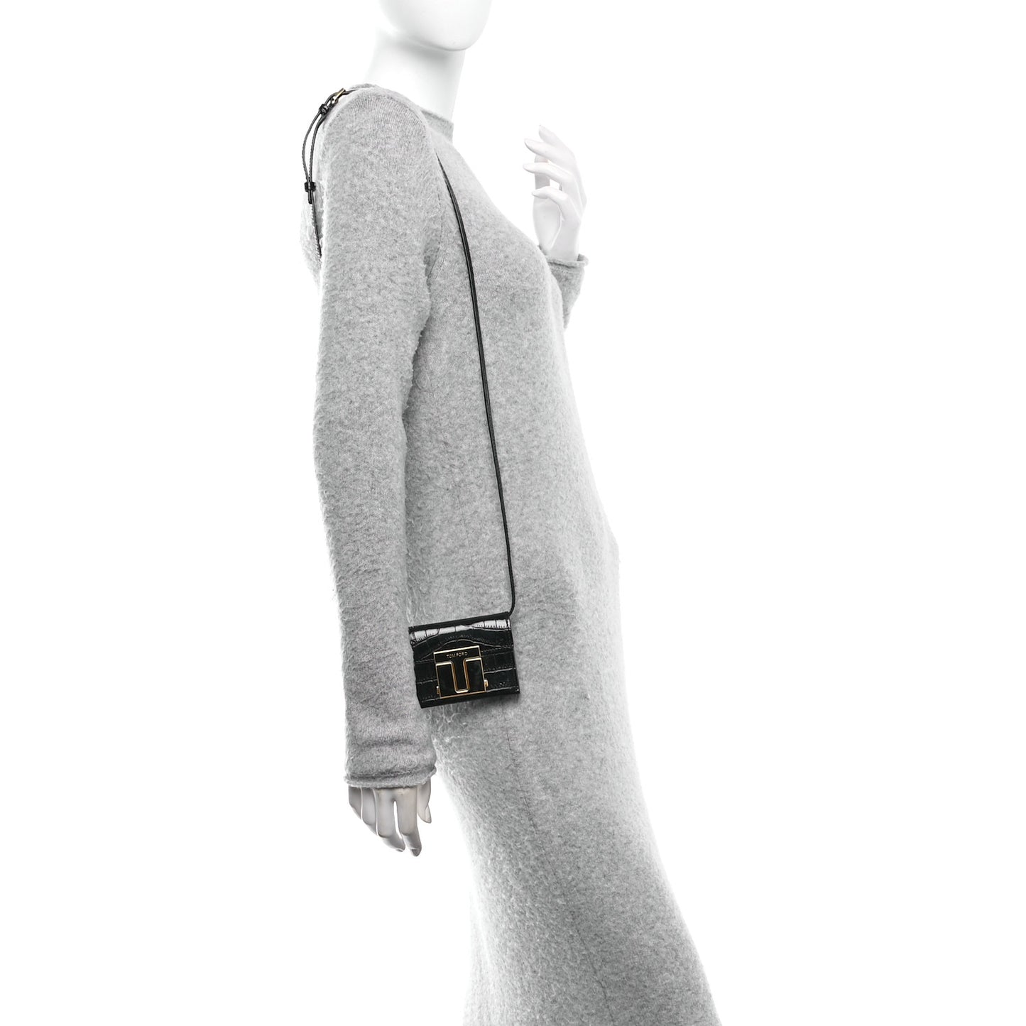 Tom Ford/ Bags/ Shoulder Bags /Tom Ford Calfskin Crocodile Embossed Mini T Clasp Accordion Wallet With Strap Black