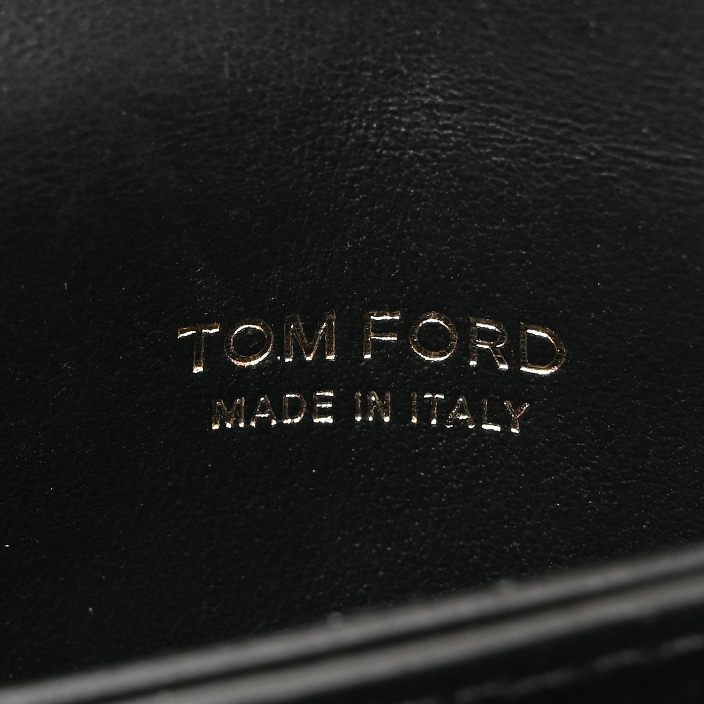 This is an authentic TOM FORD Metallic Calfskin Crocodile Embossed Mini T Clasp Accordion Wallet With Strap in Black. This stylish shoulder bag is crafted of crocodile embossed black leather. The wallet features an optional strap and front flap with a gold T closure. The wallet opens to a black leather interior with card slots.Follow this item for alerts. Tom Ford is a registered trademark of Tom Ford. FASHIONPHILE is not affiliated with Tom Ford.