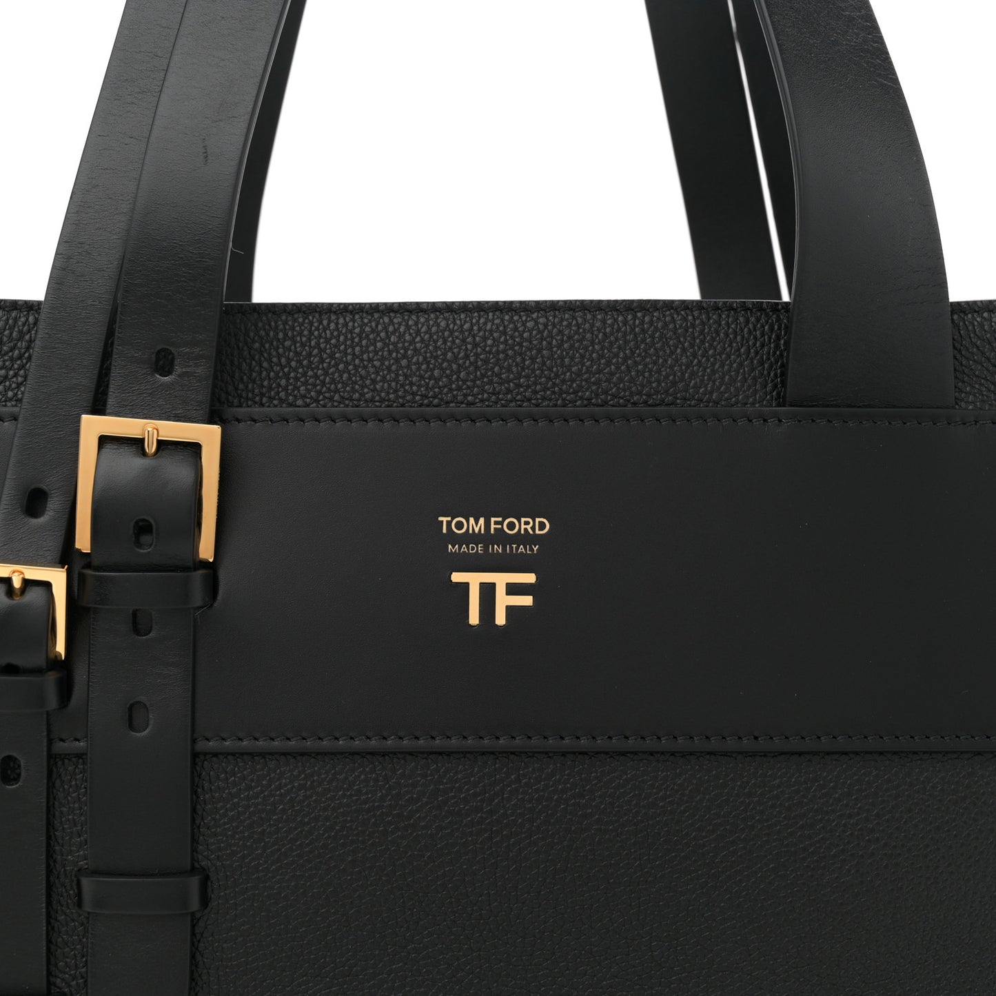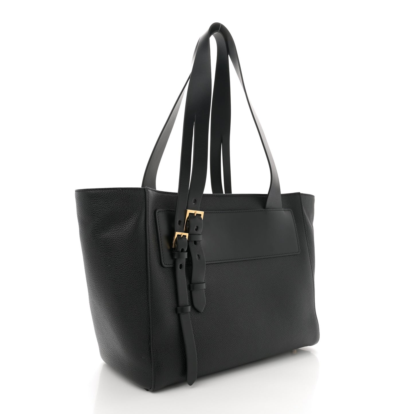 This is an authentic TOM FORD Grained Calfskin Buckle Tote in Black. This stylish tote is crafted of grained calfskin leather in black. This bag features a front patch with a gold Tom Ford logo and leather strap handles. The bag has an open top and opens to a beige fabric interior with a zipper and patch pockets.Follow this item for alerts. Tom Ford is a registered trademark of Tom Ford. FASHIONPHILE is not affiliated with Tom Ford.