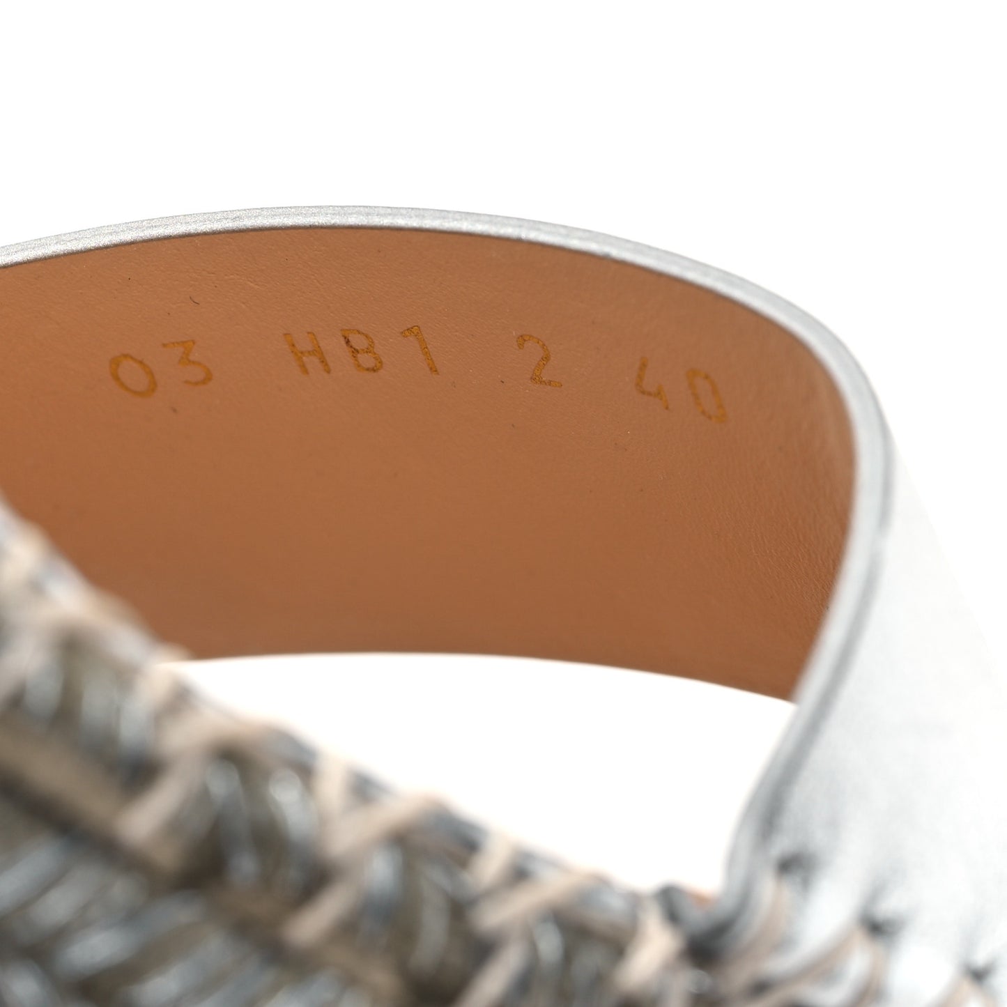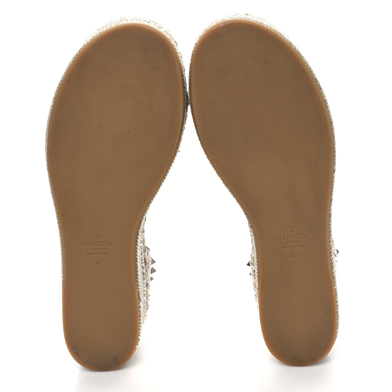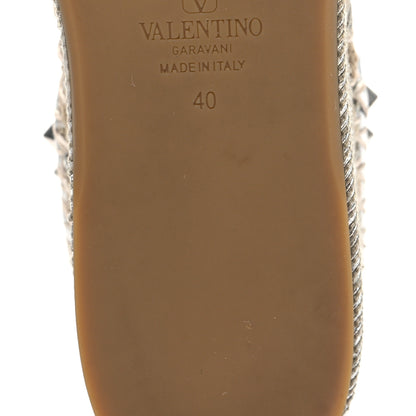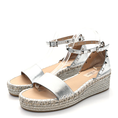 Metallic Grained Calfskin Rockstud Ankle Wrap Espadrille Flatform Sandals 40 Silver