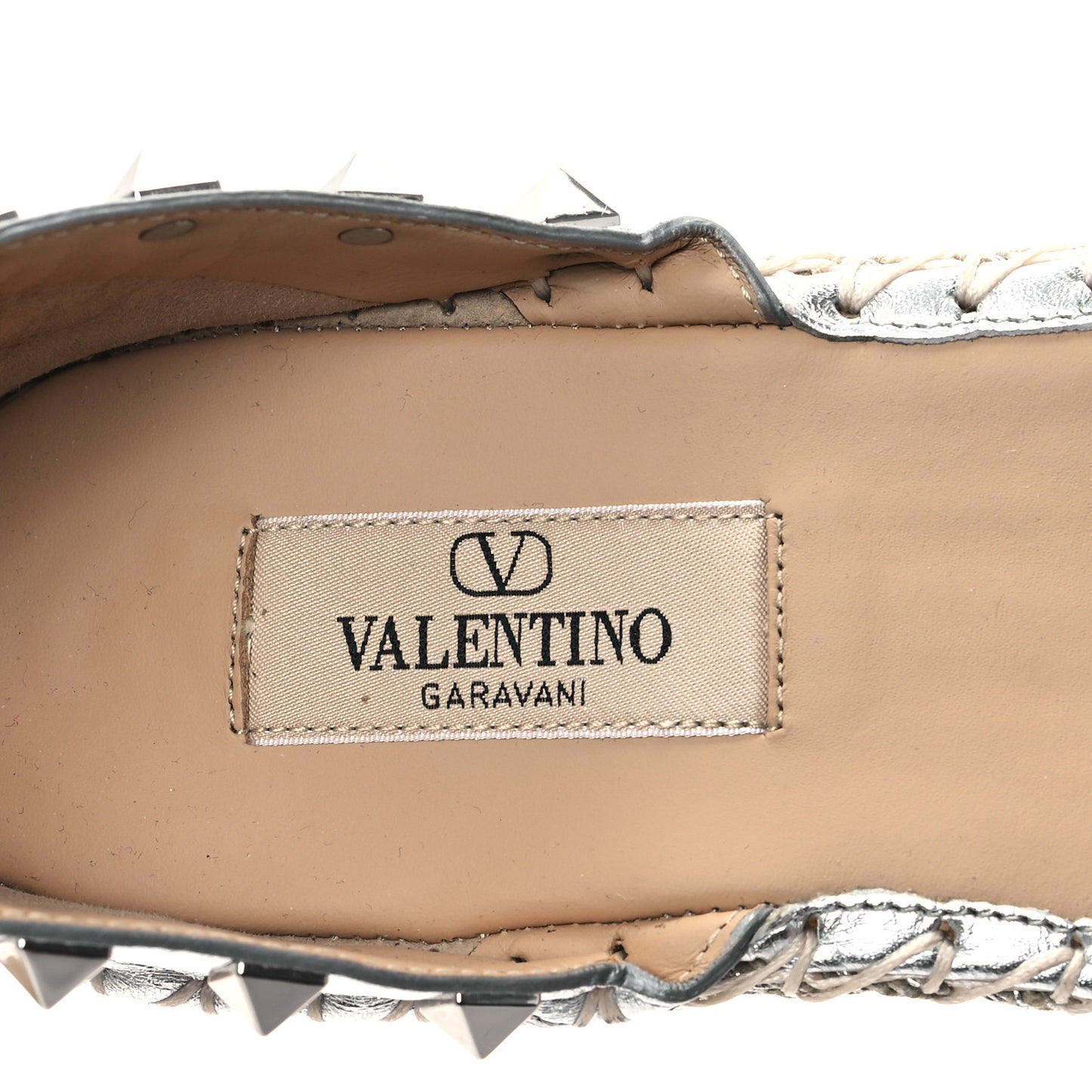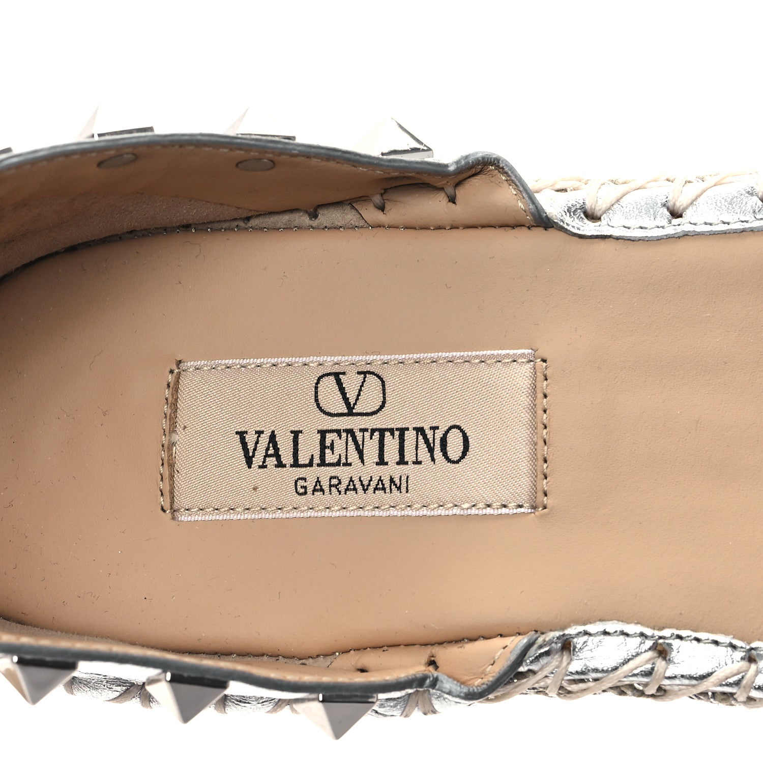 This is an authentic pair of VALENTINO GARAVANI Metallic Grained Calfskin Rockstud Ankle Wrap Espadrille Flatform Sandals size 40 in Silver. These essentials feature stunning silver studded leather straps and a 1.75 inch platform.Follow this item for alerts. Valentino Garavani is a registered trademark of Valentino Garavani. FASHIONPHILE is not affiliated with Valentino Garavani.