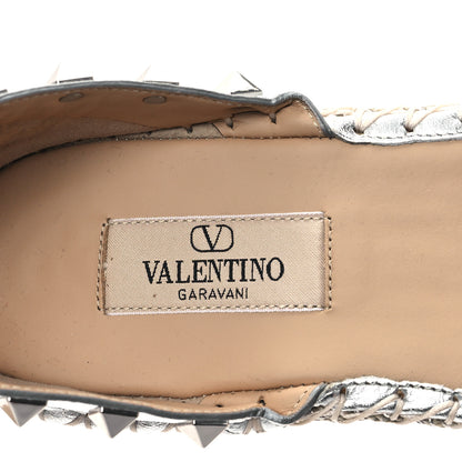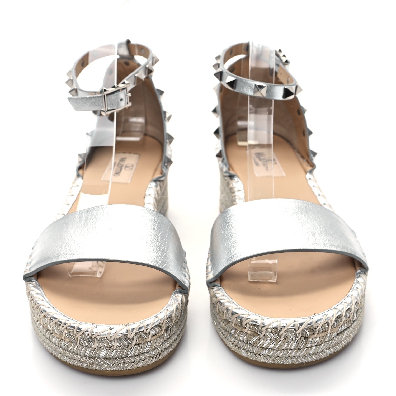 Valentino Garavani/ Accessories/ Shoes /Valentino Garavani Metallic Grained Calfskin Rockstud Ankle Wrap Espadrille Flatform Sandals 40 Silver