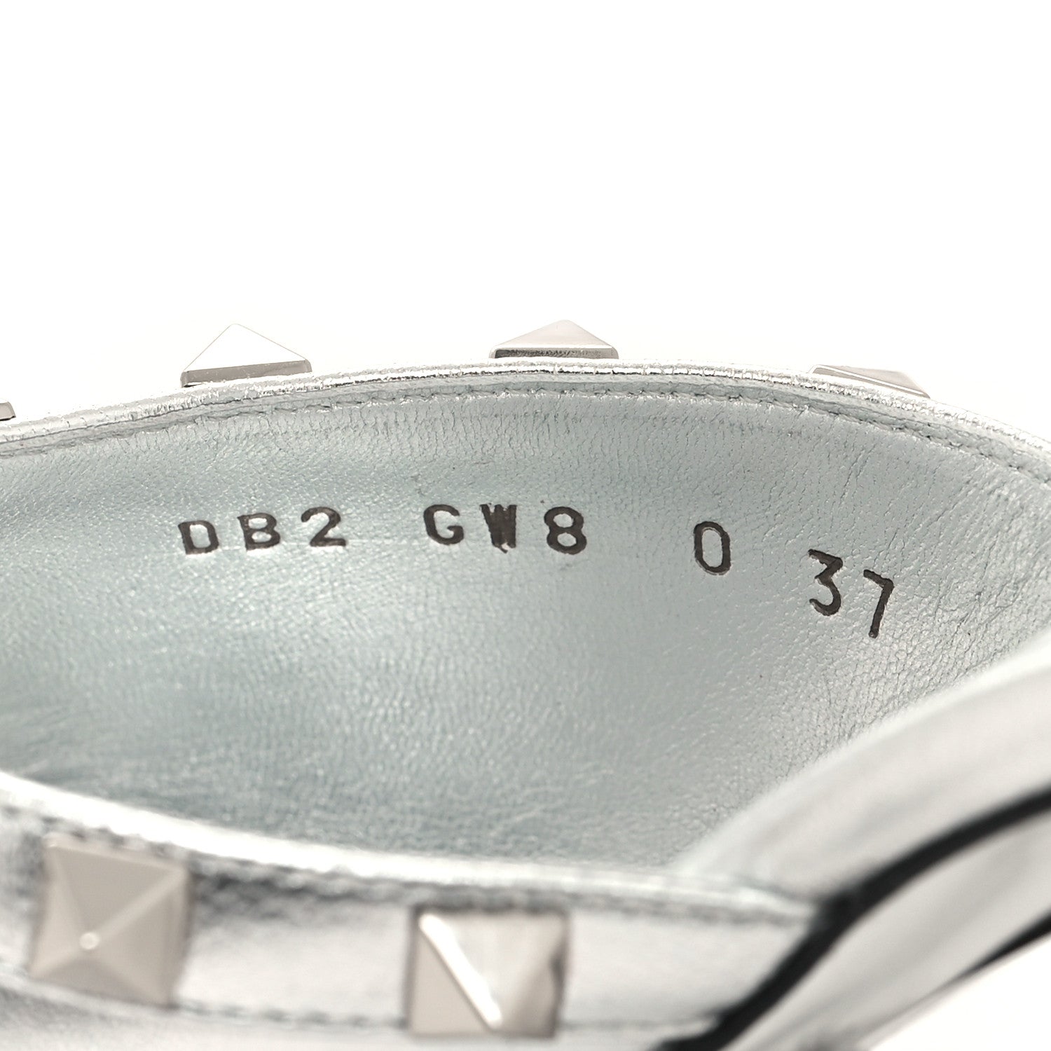 This is an authentic pair of VALENTINO GARAVANI Metallic Lambskin Plexiglass Rockstud 75mm Wedge Sandals size 37 in Silver and Transparent. These chic sandals are crafted of nappa leather in metallic silver, with a 3-inch wedge heel. They feature silver pyramid studded straps.Follow this item for alerts. Valentino Garavani is a registered trademark of Valentino Garavani. FASHIONPHILE is not affiliated with Valentino Garavani.