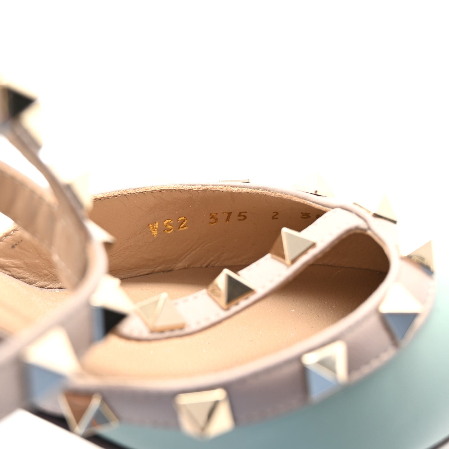 This is an authentic pair of VALENTINO GARAVANI Nappa Rockstud Ankle Strap Low Heel Pumps size 38 in Morning Dew and Poudre. These classic pumps are crafted of nappa leather in a shade of light blue and beige. There is an elongated point toe and a 2.5 inch wrapped and sharp stiletto and light gold studs in a cage of beige leather, with a sling back and wrap-around ankle strap.Follow this item for alerts. Valentino Garavani is a registered trademark of Valentino Garavani. FASHIONPHILE is not affiliated with Valentino Garavani.