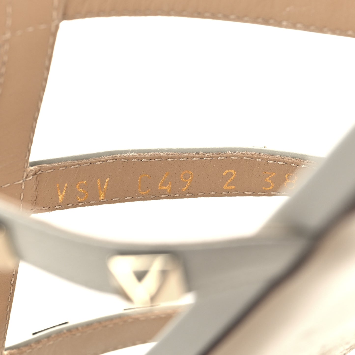 This is an authentic pair of VALENTINO GARAVANI Nappa Rockstud Caged Flat Slide Sandals size 38 in Grey. These luxurious sandals are crafted of gery calfskin leather. The straps of the cage are lined with gold pyramid studs and leather insoles.Follow this item for alerts. Valentino Garavani is a registered trademark of Valentino Garavani. FASHIONPHILE is not affiliated with Valentino Garavani.