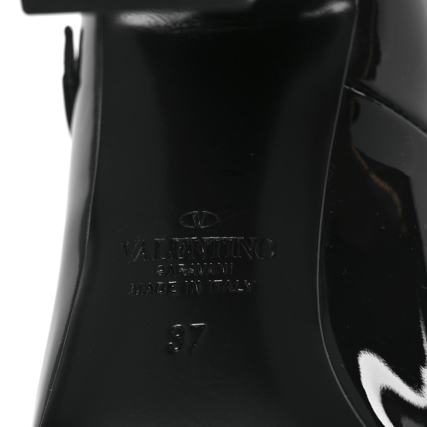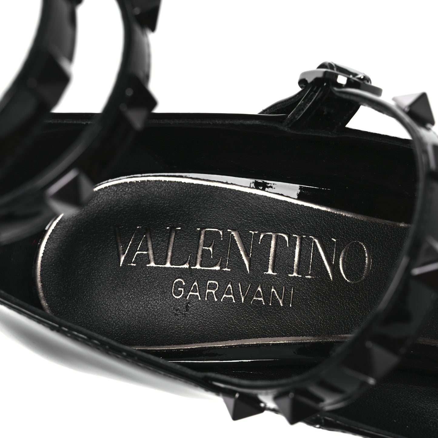 This is an authentic pair of VALENTINO GARAVANI Patent Monochrome Rockstud Tan-Go Ankle Strap Pumps size 37 in Black. These patent leather pumps feature rockstud mary-jane straps across the arch and rockstud double ankle straps with adjustable buckles. The block heel measures 3.75 inches high.Follow this item for alerts. Valentino Garavani is a registered trademark of Valentino Garavani. FASHIONPHILE is not affiliated with Valentino Garavani.